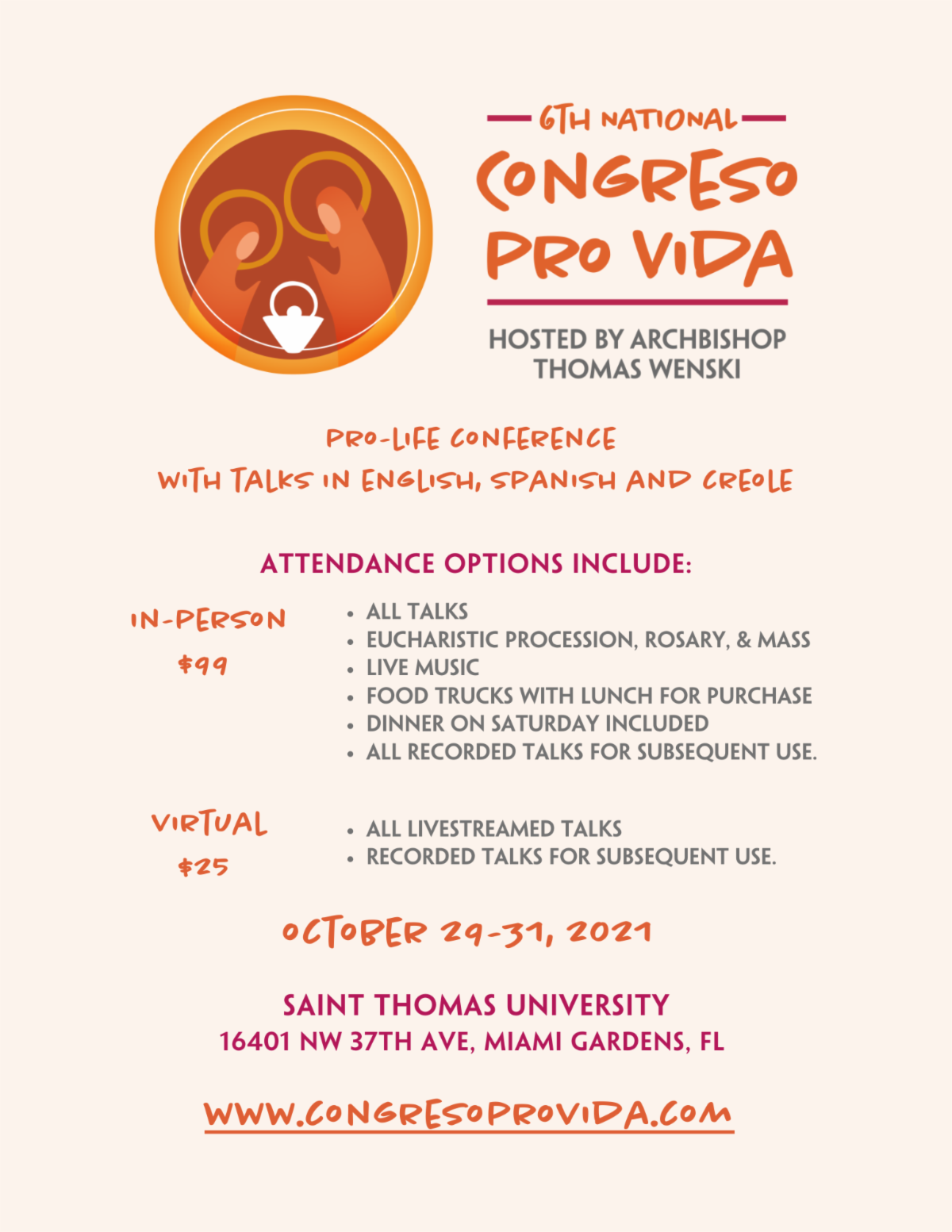 The Congreso is a pro-life conference bringing together our diverse communities with talks offered in English, Spanish, and Haitian Creole at St. Thomas University from October 29-31, 2021.