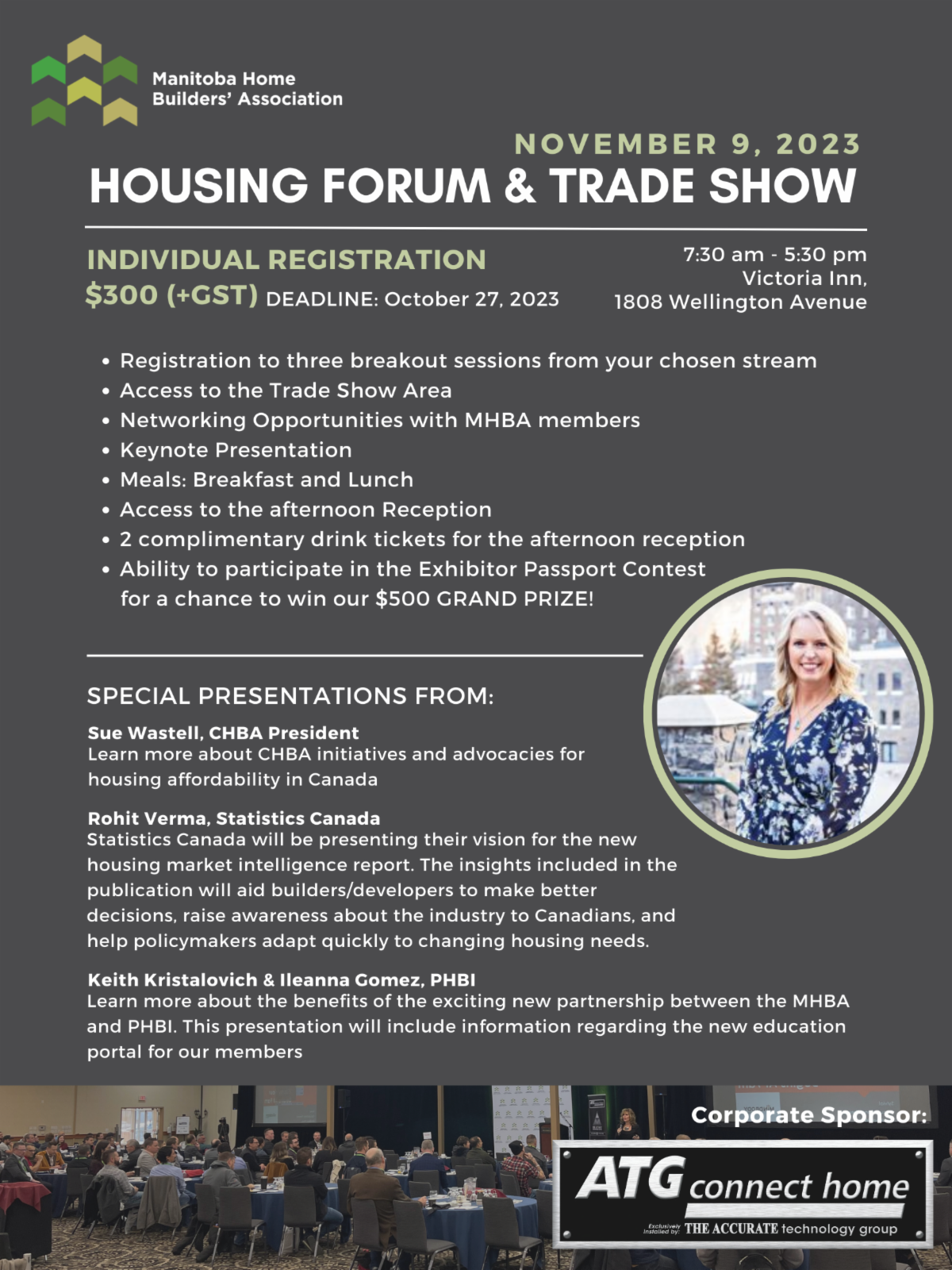MHBA's Housing Forum and Trade Show returns on November 9th at the Victoria Inn (1808 Wellington Ave.) featuring our signature trade show, captivating professional development sessions, incredible prizes, and much more!