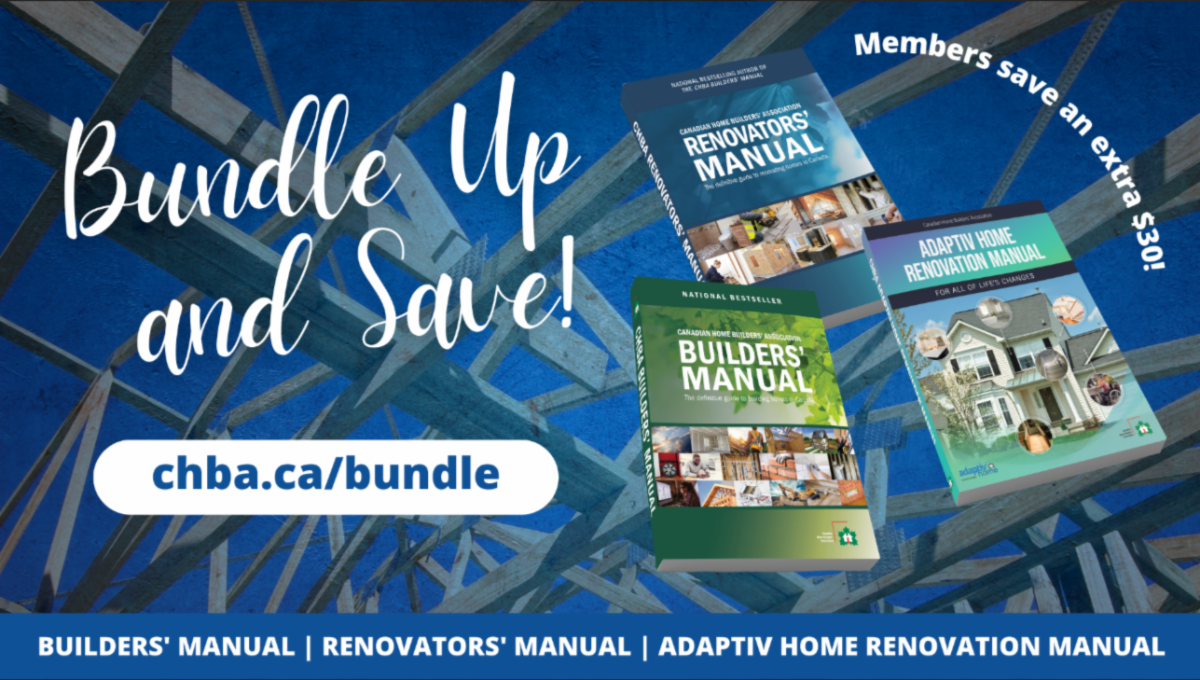 Did you know that CHBA members receive discounted pricing on the nationally bestselling Builders’ Manual, the Renovators’ Manual, and the Adaptiv Home Renovation Manual? Get a discount by bundling all three, then stack your member discount on top!