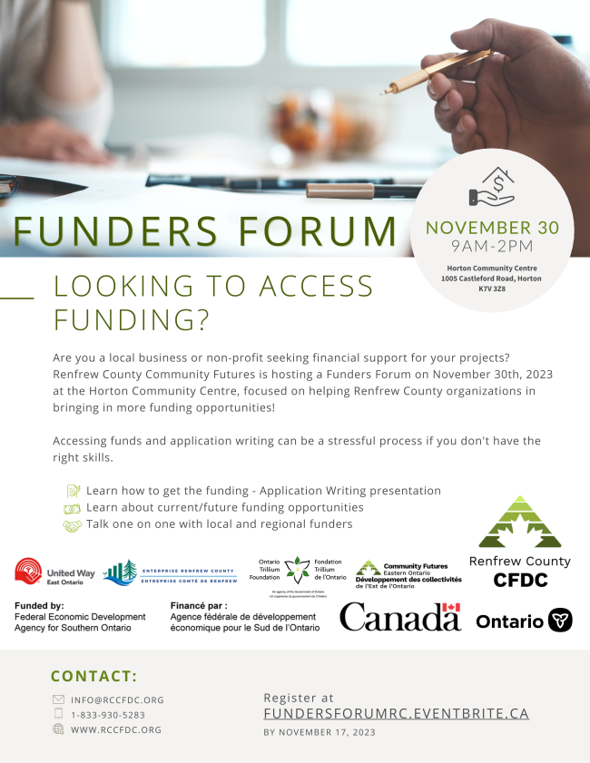Are you a local business or non-profit seeking financial support for your projects? On November 30, 2023, Renfrew County Community Futures Development Corporation will be hosting a Funders Forum.