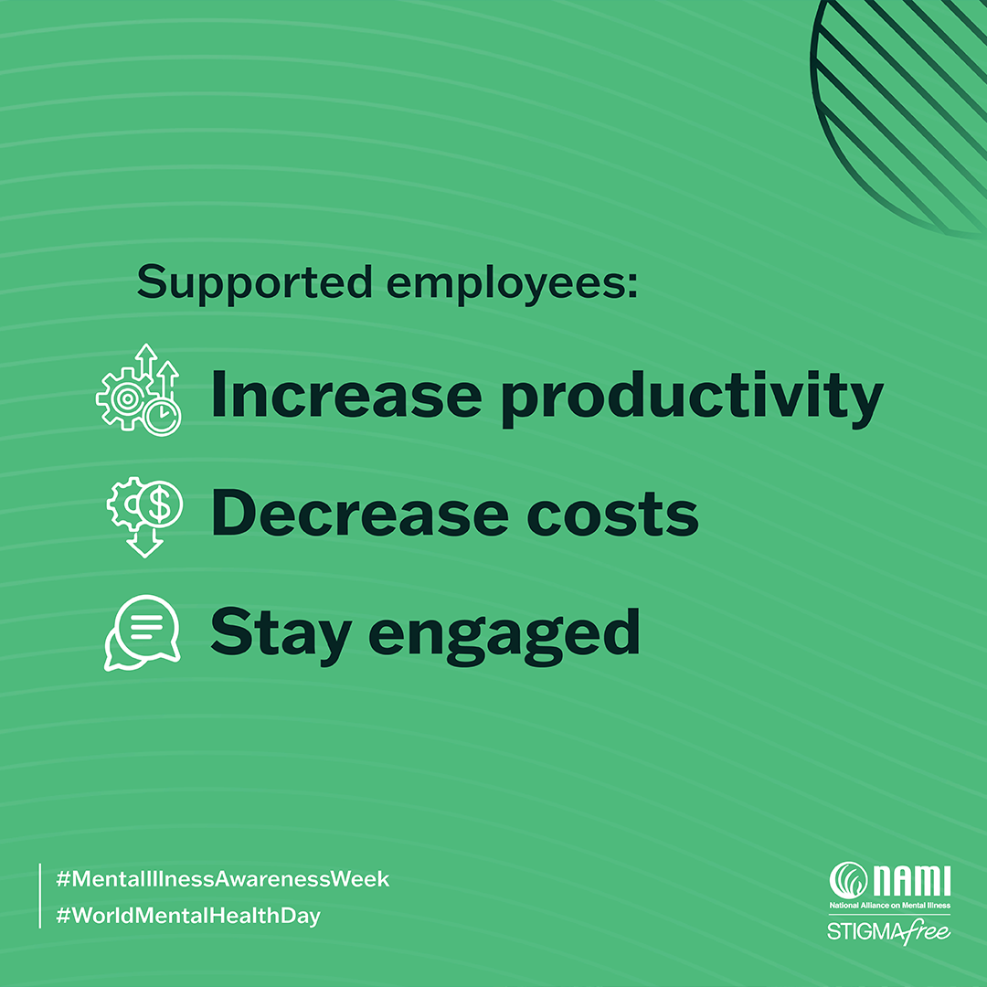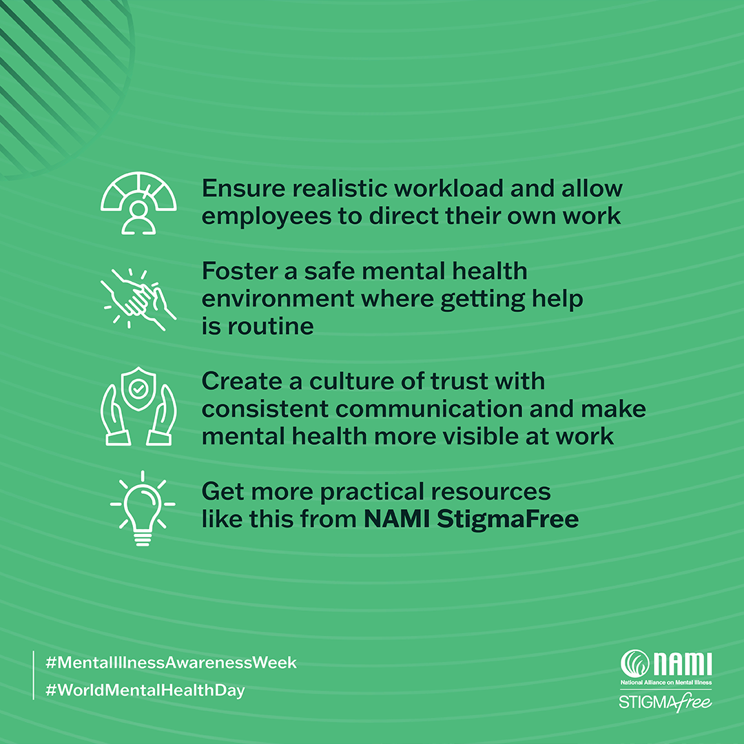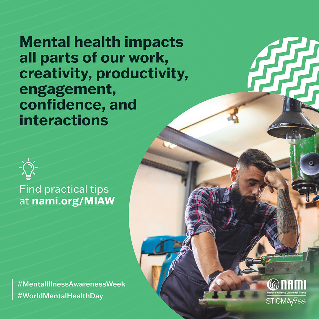 This Mental Illness Awareness Week (10/6-10/12) and World Mental Health Day (10/10) NAMI's theme is “My Mental Health at Work." Let's increase awareness around how mental health is impacted by our workplace cultures.