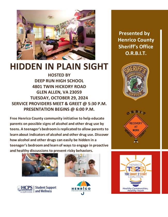 RED RIBBON WEEK (RRW) is the largest drug prevention campaign in the nation. Celebrated October 23 - 31, it's mission is to increase awareness and keep kids drug free. This year the theme is Life is a Movie, Film Drug Free! On October 22, our friends at the HTS2S Coalition will conduct a fatal vision goggles activity with the students at the Highland Springs HS ACE Center. On October 29 they will host a Hidden in Plain Sight event at Deep Run High School (see flyer below). Check out the video below to learn more about RRW and then visit their website to see how you can get involved.