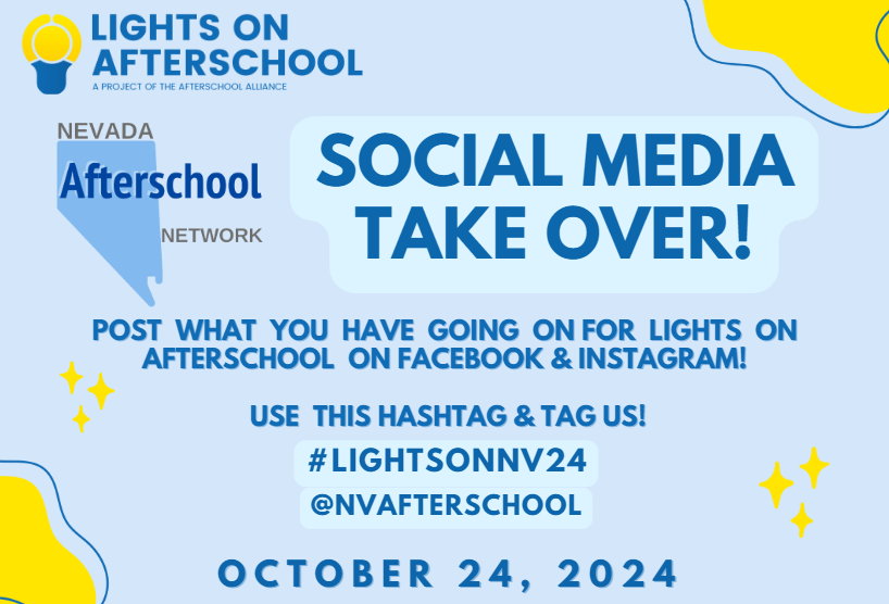 Throughout October, post about your activities and the impact of these programs on our youth on your Facebook & Instagram pages, culminating in a big push on October 24, 2024 where we will repost them! Use the hashtag #lightsonnv24 and tag us @nvafterschool to amplify your message and show your support for afterschool initiatives in our community!
