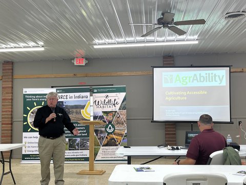 An Indiana NRCS diversity training was conducted at the Shelby County Fairgrounds with a focus on Indiana AgrAbility and working with farmers with disabilities. Bill Field, Steve Swain, Joe Ricker, and Indiana AgrAbility client Laurie Hayn presented the background of AgrAbility, assistive technology assessments and examples, and a client view of services and the need. More
