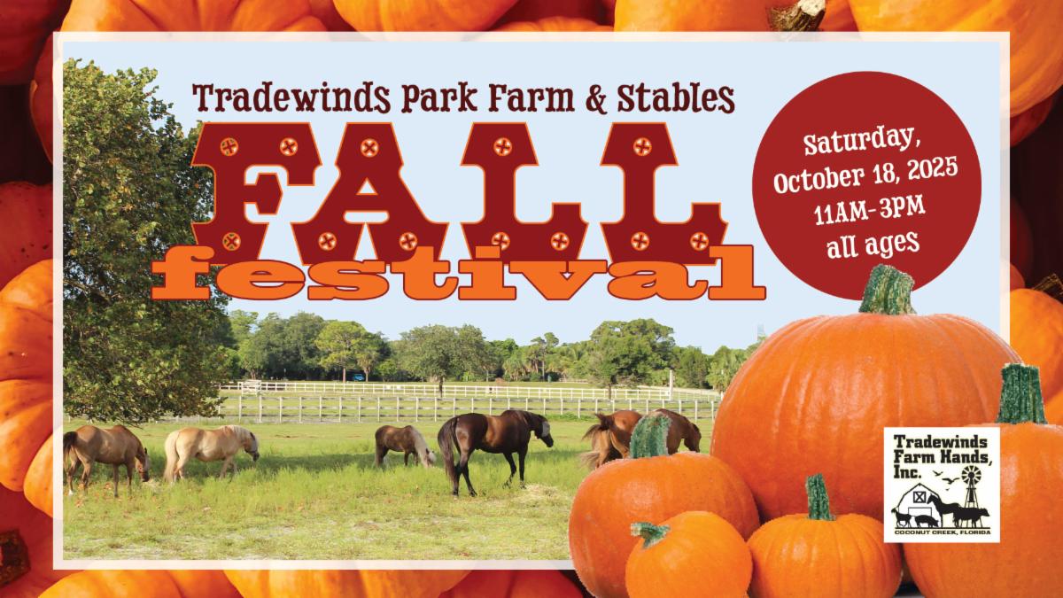 Fall festival at Tradewinds Park and Stables on October 18 at 11AM. Sponsored by the Tradewinds Farm Hands, this family event includes a pumpkin patch, obstacle course, food trucks, bounce houses, animal interactions, and more.