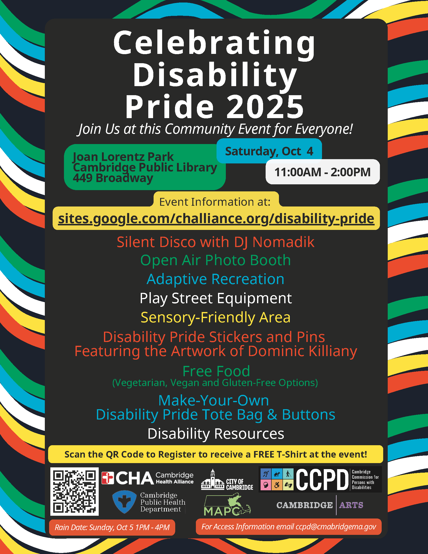 Image description: The flyer has a black background with a multi-colored border. Header in white text: Celebrating Disability Pride 2025; next line, in smaller white font: Join Us at this Community Event for Everyone! Below in 3 boxes of different colors from left to right: Green in black text: Joan Lorentz Park, Cambridge Public Library, 449 Broadway, right top: dark aqua in black text: Saturday, Oct 4, below in white with black text: 11:00AM-2:00PM. Below in a yellow box with black texts: Event Information at sites.google.com/challiance.org/disability-pride Below lined in different color fonts: Silent Disco with DJ Nomadik Open Air Photo Booth Adaptive Recreation Play Street Equipment Sensory-Friendly Area Disability Pride Stickers and Pins Featuring the Artwork of Dominic Killiany Free Food (Vegetarian, Vegan and Gluten-Free Options) Make-your-Own Disability Pride Tote Bag & Buttons Disability Resources In a yellow banner in black text: Scan the QR Code to Register to receive a FREE T-Shirt at the Event! Below: A QR code and logos of 6 sponsors: Cambridge Health Alliance, City of Cambridge, Cambridge Commission for Persons with Disabilities, Cambridge Public Health Department, MAPC and Cambridge Arts. At the bottom: 2 red boxes in white text: on the left: Rain Date: Sunday, Oct 5 1PM-4PM; on the right: For Access Information email: ccpd@cambridgema.gov |