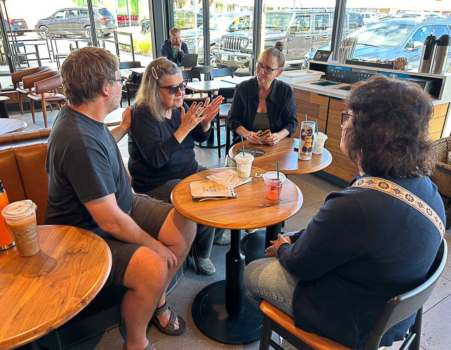 Image description: A group of 4 people seated at 2 circular tables in a cafe. From left to right: a man in a black t-shirt and glasses is sitting next to a woman wearing a black shirt and sunglasses, who is signing. To her left, i sa woman with glasses and her hair pulled back. A forth person, with dark curly hair and a patterned strap on their shoulder, is seated with her back toward the camera. There are several drinks on the tables. The cafe has large windows with cars and other buildings visible outside. |