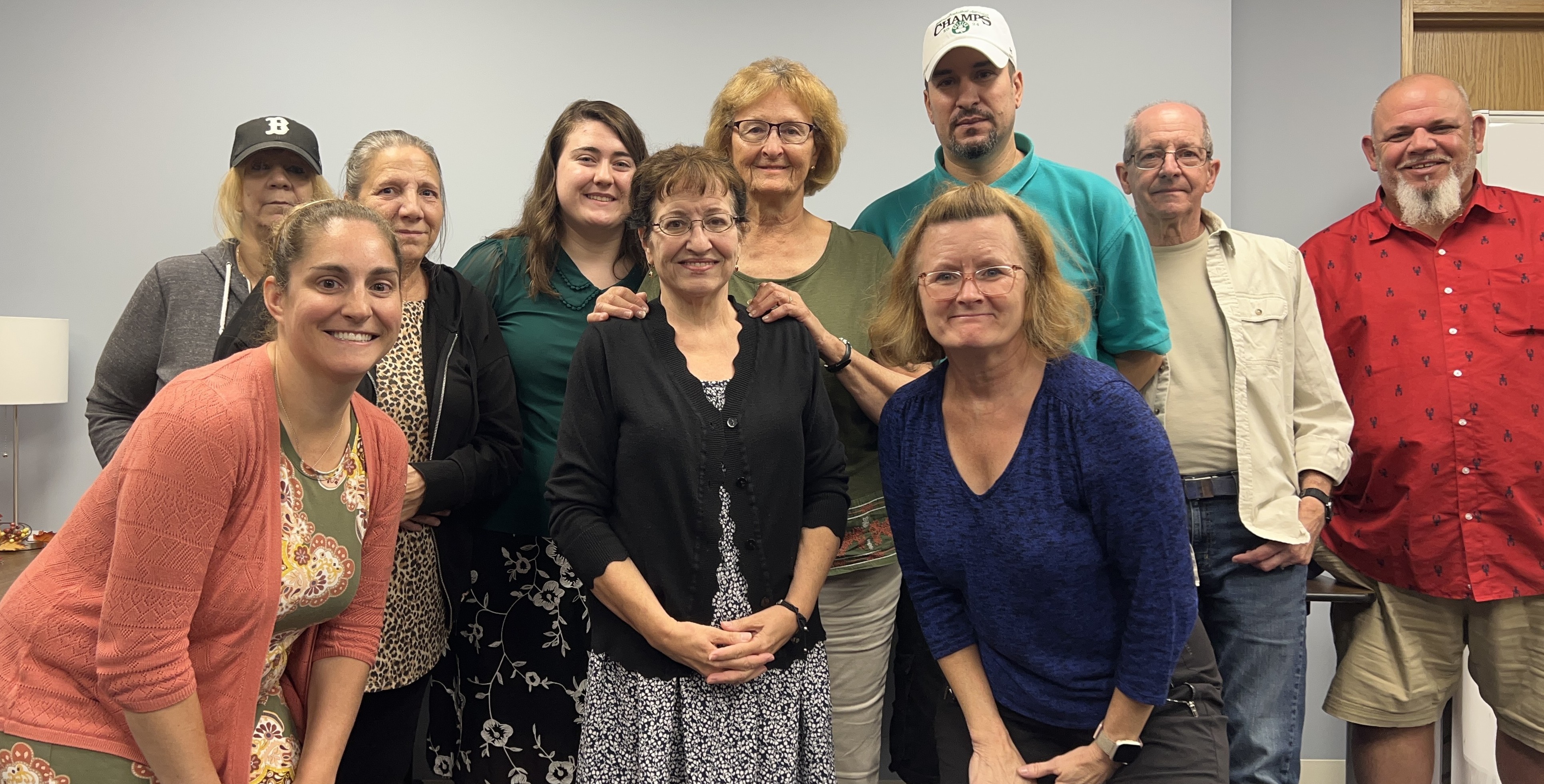 Image description: A group of people standing, posing and smiling for the camera. |