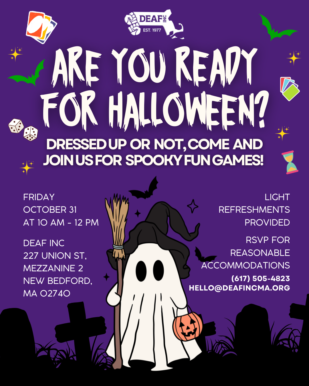 Image description: The flyer has a purple background with white DEAF, Inc. logo at middle top with two green bats and 3-4 playing cards on the edge on both sides, along with two dice, an hourglass and four sparkling yellow stars. Under the logo, in the bold all caps white text: Are you ready for Halloween? Underneath the title, the subtitle in the bold all caps “Dressed up or not, come and join us for spooky fun games! On the second half of the flyer in the middle, it has a ghost with a black witchy hat holding a brown broom and an orange pumpkin basket. In all black, there is a small black bat just above the ghost and it is standing in the cemetery: two stone burials and three crosses with wild grasses. On the left side of the ghost with a broom, in the white text: Friday, October 31 at 10am -12pm. After that in the white text: DEAF Inc 227 Union St, Mezzanine 2, New Bedford, MA 02740 On the right side of the ghost with a pumpkin basket: in white text: Light refreshments provided. Under that, RSVP for reasonable accommodations and in bold white text: (617) 505-4823 hello@deafincma.org |