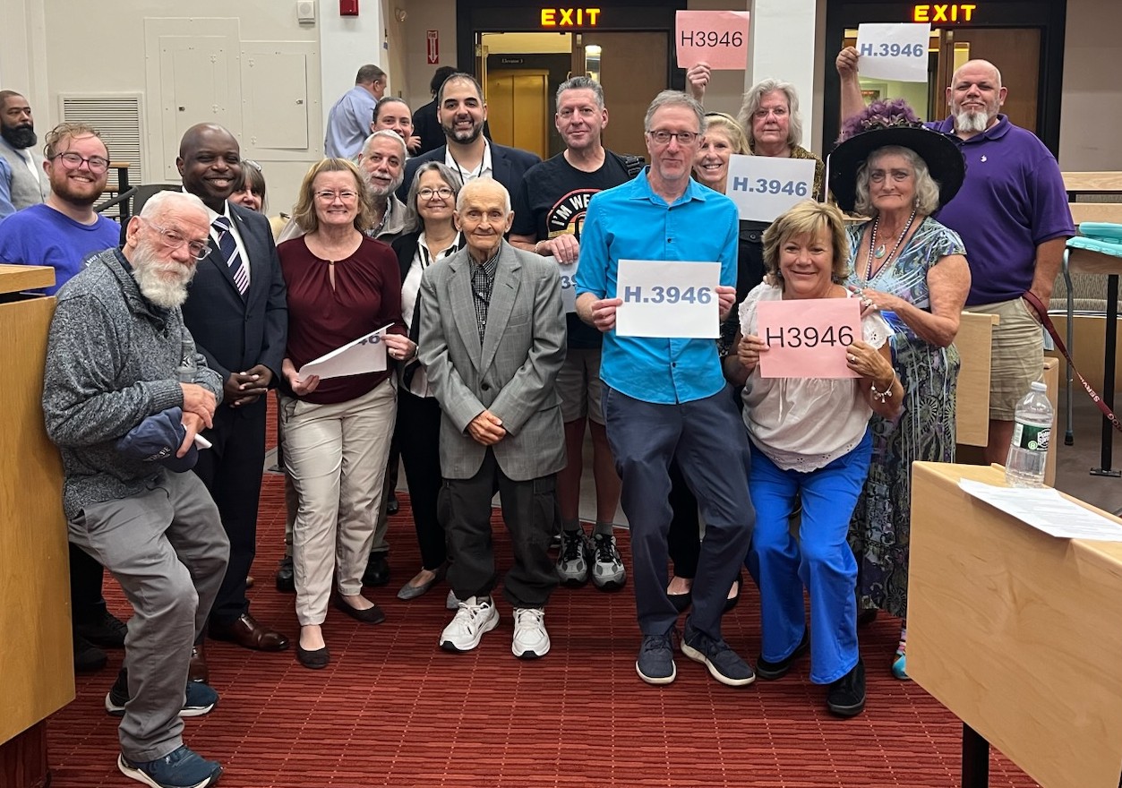 Image description: A group of people standing together, inside the hearing room, some are holding the "H.3946" sign, smiling and posing for the camera. |