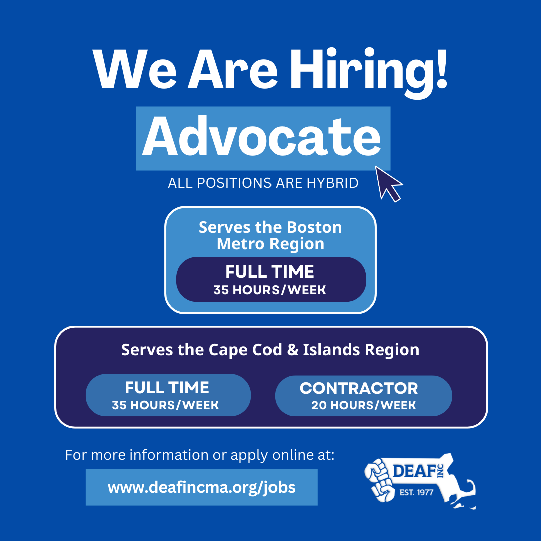 Image description: Blue background with white text: We Are Hiring! Advocate – All positions are hybrid. Below are two location listings: Top box in medium blue: Serves the Boston Metro region: Full time: 35 hours/week. Bottom box in navy blue: serves the Cape Cod & Islands Region: Full time: 35 hours/week & Contractor: 20 hours/week. For more information or to apply online, visit www.deafincma.org/jobs. Bottom right corner: white DEAF, Inc. logo. |