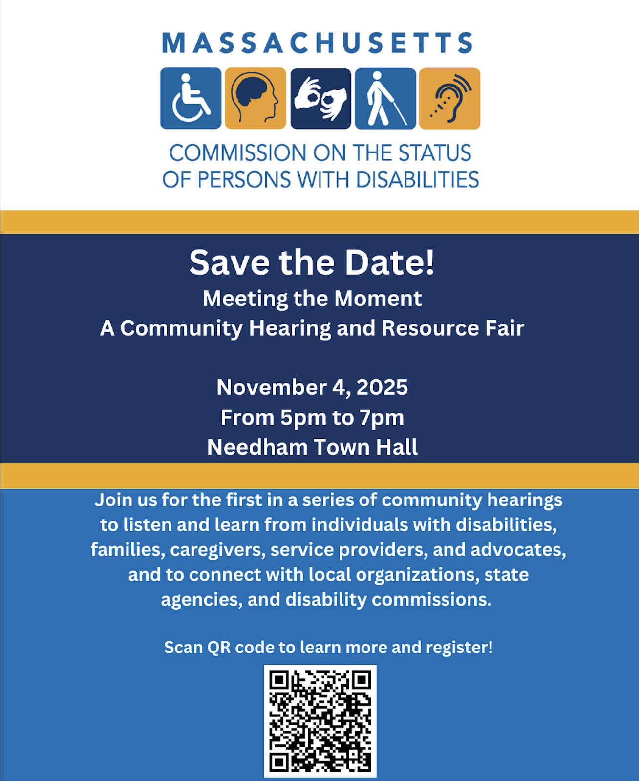 Image description: Flyer with white banner with medium blue text, header in center: MASSACHUSETTS, below are 5 different icons indicating types of disabilities: wheelchair, brain, interpreter hands, blind person using a cane, and an ear. Below: COMMISSION ON THE STATUS OF PERSONS WITH DISABILITIES. Below in a navy blue background with 2 thick yellow dividers, in white text: Save the Date! Meeting the Moment, A Community Hearing and Resource Fair, November 4, 2025 From 5pm to 7pm Needham Town Hall. Below in medium blue background in white text: Join us for the first in a series of community hearings to listen and learn from individuals with disabilities, families, caregivers, service providers, and advocates, agencies and disability commissions. Scan QR code to learn more and register! At bottom: QR code. |