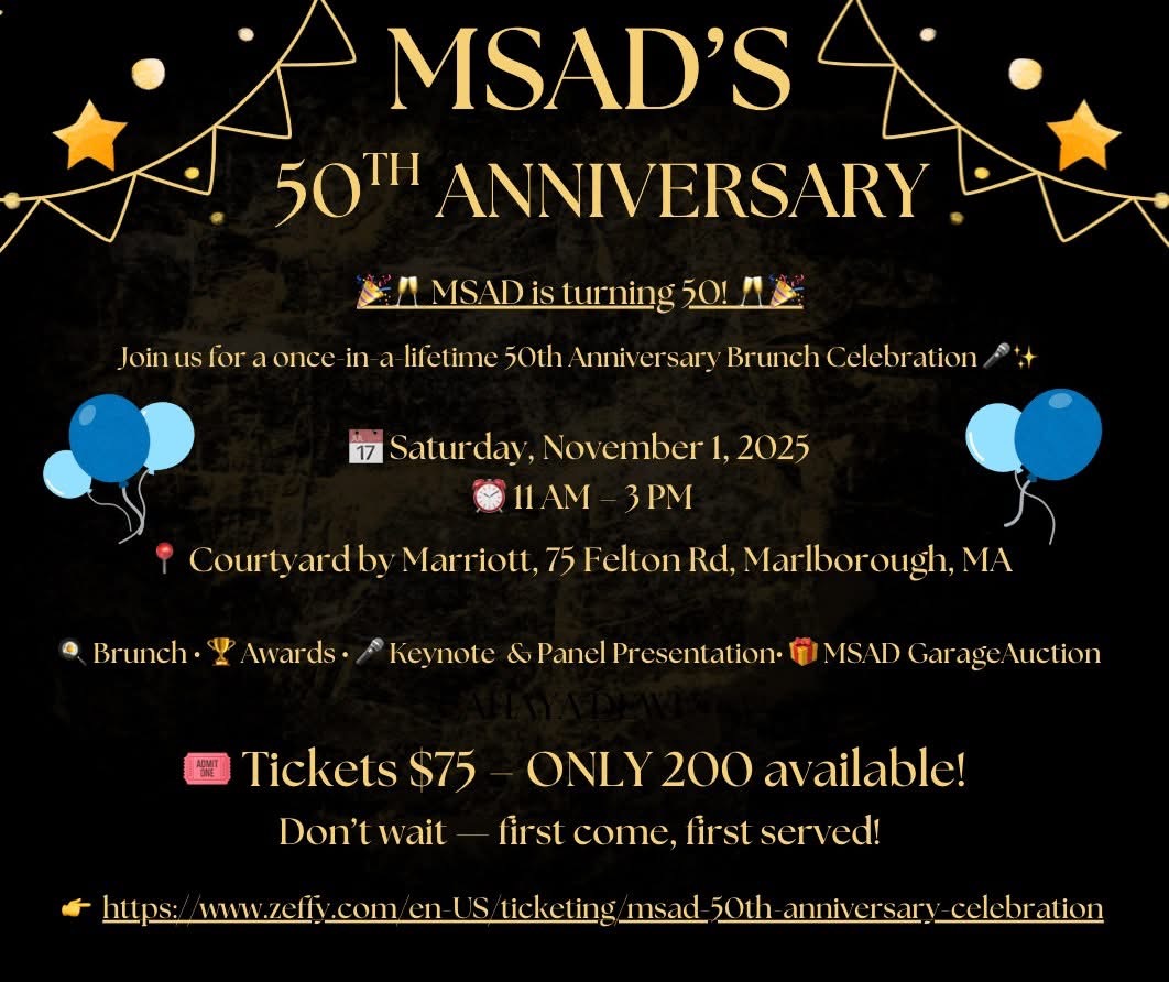 Image Description: Flyer with black background with yellowish-gold text. Header in center and in caps: MSAD'S 50th Anniversary; top left and right corners: star and spheres and streamers with pennants. Below: celebration & champagne emoji on both sides MSAD is turning 50! Left: 3 balloons, 2 light blue and one medium blue, on the right: 2 balloons, one light blue, the other medium blue, Center: calendar emoji, Saturday, November 1, 2025. Clock emoji, 11 AM - 3 PM Location emoji, Courtyard by Marriott, 75 Felton Rd., Marlborough, MA Brunch, Awards, Keynote & Panel Presentation MSAD Garage Auction Tickets: $75- ONLY 200 available! Don't wait - first come, first served! https://www.zeffy.com/en-US/ticketing/msad-50th-anniversary-celebration |