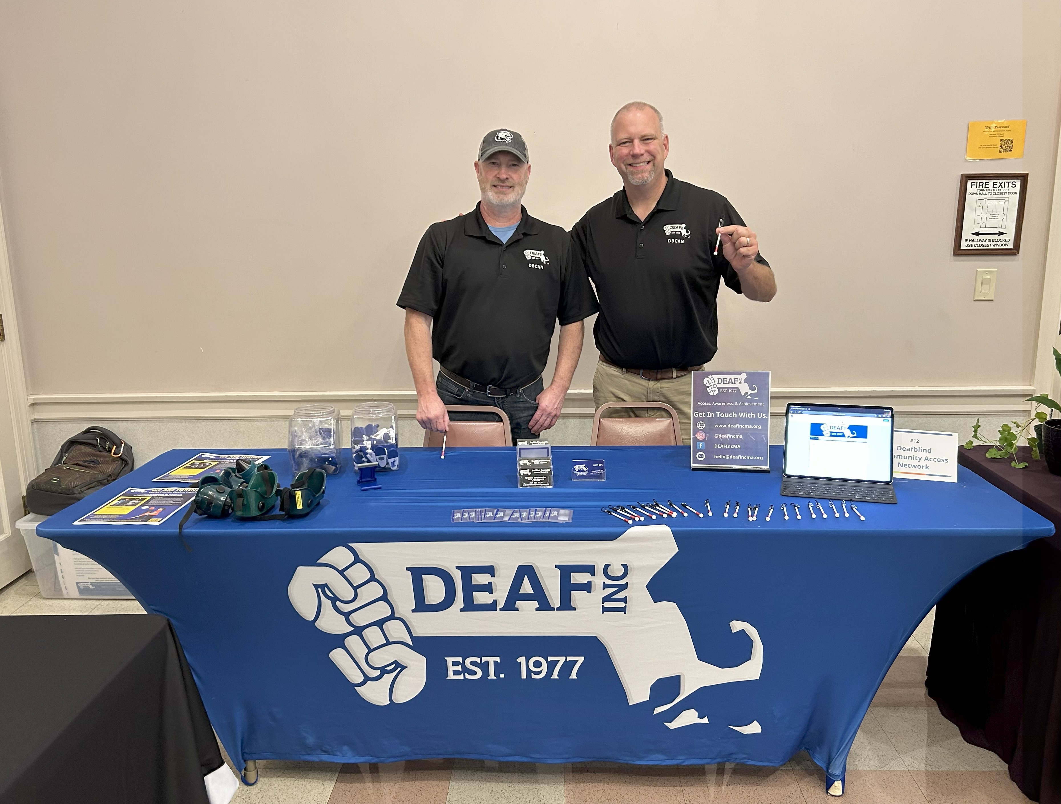 Image description: From left to right: DBCAN director, Jonathan LeJeune, is wearing a black polo shirt with a white DEAF, Inc. logo and a baseball cap. He is holding a white cane pin with his right hand on the table. DBCAN Administrative Assistant & Co-Navigator, William Stratemeier, is wearing a black polo shirt with a white DEAF, Inc. logo, smiling and holding up a small white cane pin. They are standing behind a table covered with a bright blue tablecloth featuring the DEAF, Inc. logo in white. The table has several different promotional items across it, along with informational brochures, white cane pins, a jar of lanyards and a laptop showing a presentation with a light-colored wall behind them. A fire exit sign is on the wall to the right. |