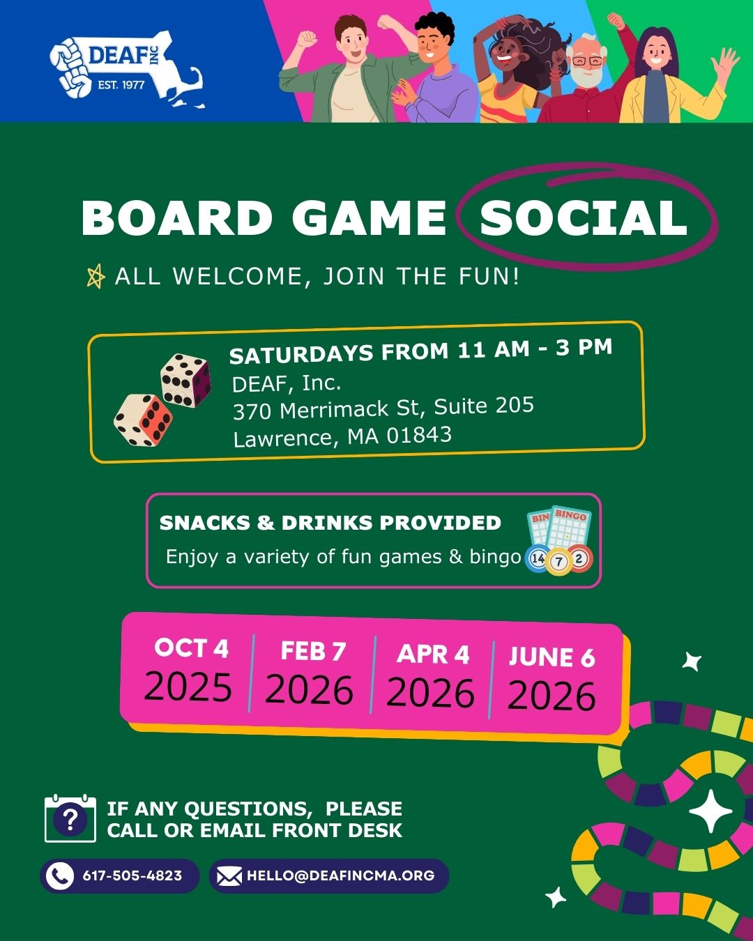 Image description: This flyer is in green background with texts in white and colorful blocks and dices. On the top border, five happy people celebrating with blue, pink, light blue, and green stripes and DEAF, Inc. logo in white. DEAF, Inc. is hosting Board Game Social (circled). All welcome, join the fun! Saturdays from 11 AM - 3 PM EST at DEAF, Inc. 370 Merrimack St, Suite 205 Lawrence, MA 01843. Snacks & Drinks provided. Enjoy a variety of fun games & Bingo. 2025 Events: Oct 4. 2026 Events: Feb 7, Apr. 4, and June 6. If any questions, please call or email front desk at 617-505-4823 & hello@deafincma.org. |