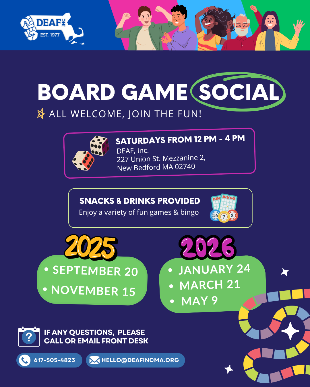 Image description: This flyer is in dark blue background with texts in white and colorful blocks and dice. On the top border, five happy people celebrating with blue, pink, light blue, and green stripes and DEAF, Inc. logo in white. DEAF, Inc. is hosting Board Game Social (circled). All welcome, join the fun! Saturdays from 11 AM - 3 PM EST at DEAF, Inc. 227 Union St, Mezzanine 2, New Bedford, MA 02740. Snacks & Drinks provided. Enjoy a variety of fun games & Bingo. 2025 Events: Sept. 20 and Nov. 15. 2026 Events: Jan. 24, Mar. 21, and May 9. If any questions, please call or email front desk at 617-505-4823 & hello@deafincma.org. |