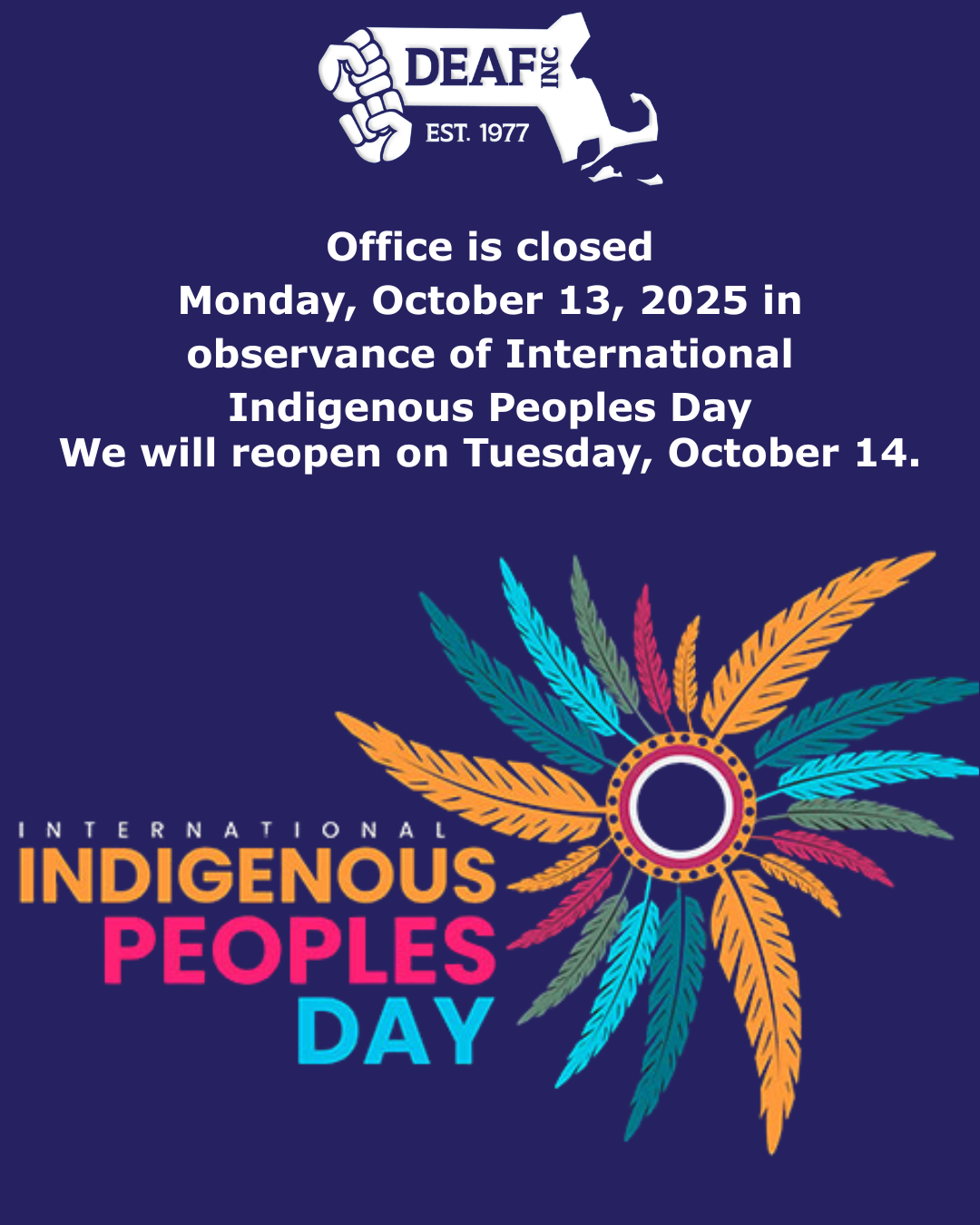Image description: Flyer with a navy blue background, top, centered: DEAF, Inc. logo in white. Below in white text: Office is closed Monday, October 13, 2025 in observance of International Indigenous Peoples Day. We will reopen on Tuesday, October 14. Below: on the left, in bright colored text (yellow-orange, pink and blue) INTERNATIONAL INDIGENOUS PEOPLES DAY, on the right is an image of a dream catcher with multicolored feathers in orange, teal, blue, green, pink, yellow, forming a sunburst. |