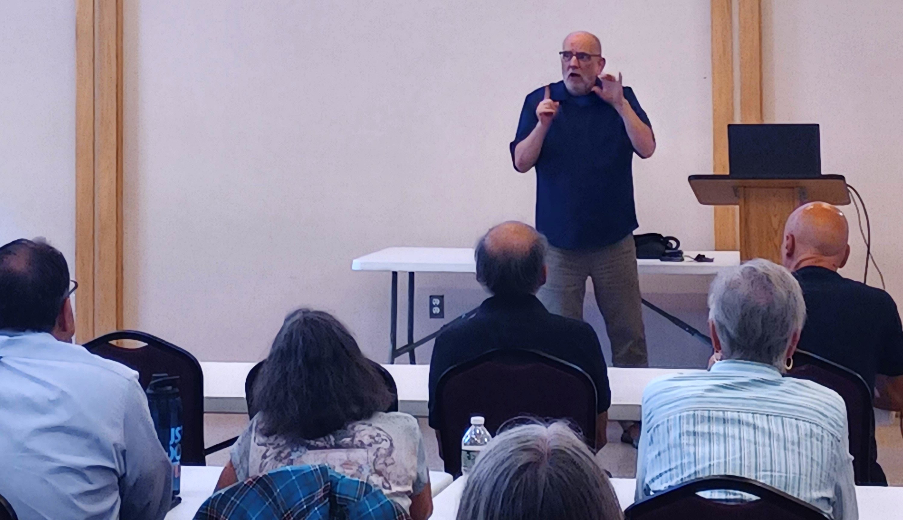 Image description: DEAF, Inc. Regional Coordinator - Northshore- Ronald Bergenheim standing in front of an audience, giving a presentation about what services DEAF, Inc. offers. |