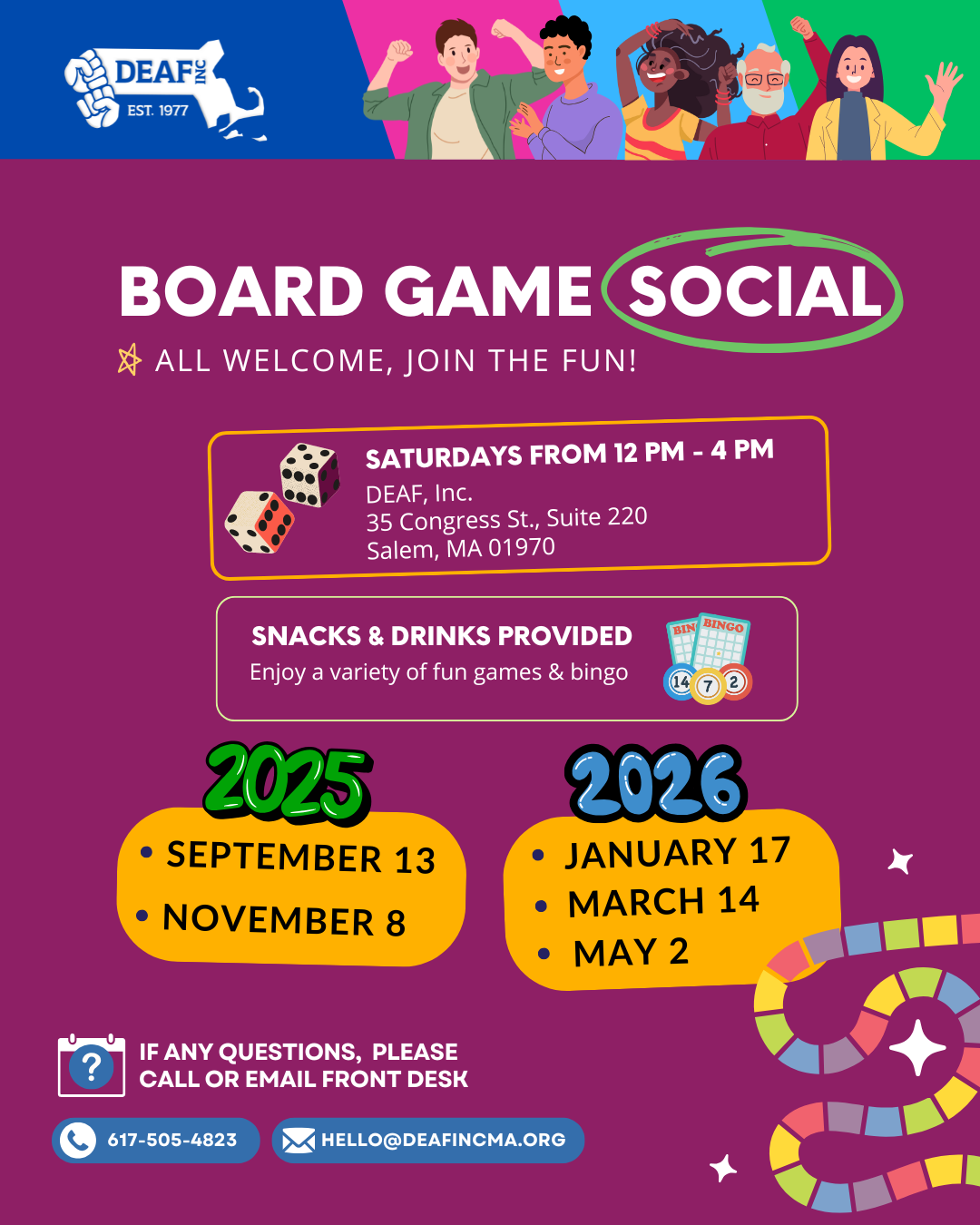 Image description: This flyer is in maroon background with texts in white and colorful blocks and dice. On the top border, five happy people celebrating with blue, pink, light blue, and green stripes and DEAF, Inc. logo in white. DEAF, Inc. is hosting Board Game Social (circled). All welcome, join the fun! Saturdays from 11 AM - 3 PM EST at DEAF, Inc. 35 Congress St., Suite 220 Salem, MA 01970. Snacks & Drinks provided. Enjoy a variety of fun games & Bingo. 2025 Events: Sept. 13 and Nov. 8. 2026 Events: Jan. 17, Mar. 14, and May 2. If any questions, please call or email front desk at 617-505-4823 & hello@deafincma.org. |