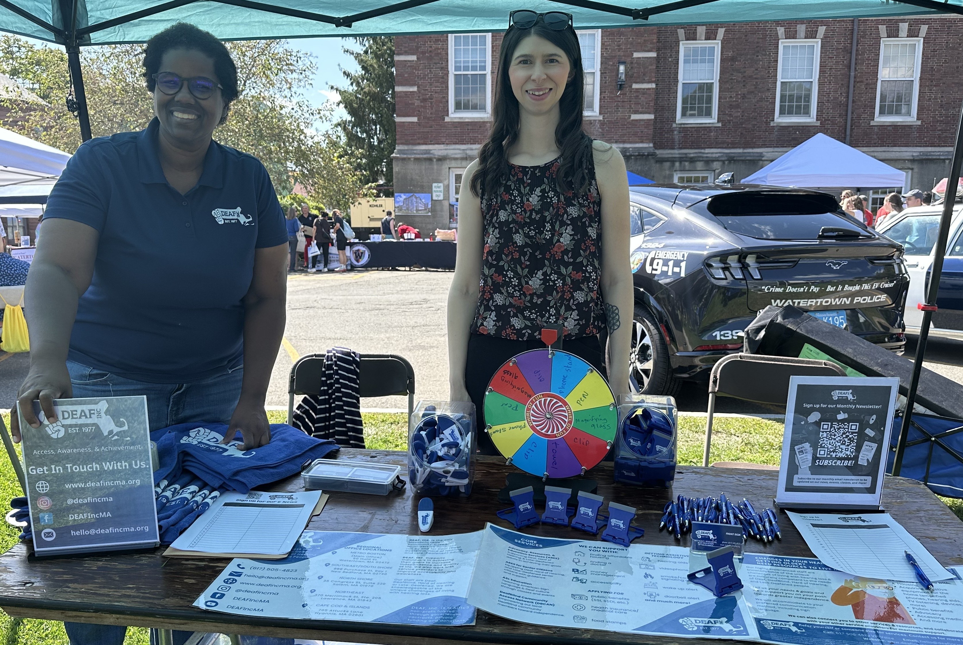 Image description: On the left: DEAF, Inc. Advocate - Boston, Takiyah "Taki" Harris and on the right, Lead Regional Coordinator - Boston, Nicole Dergosits are at the Watertown's annual Faire on the Square event, standing outside under a tent behind a table with a multi-colored prize wheel in the middle, surrounded by several different promotional items across the table. |