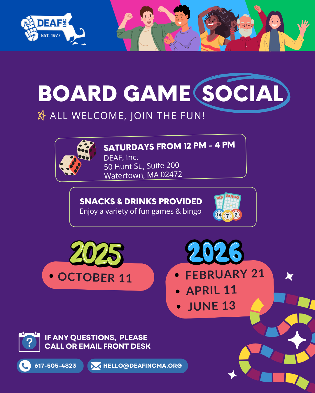 Image description: This flyer is in purple background with texts in white and colorful blocks and dices. On the top border, five happy people celebrating with blue, pink, light blue, and green stripes and DEAF, Inc. logo in white. DEAF, Inc. is hosting Board Game Social (circled). All welcome, join the fun! Saturdays from 11 AM - 3 PM EST at DEAF, Inc. 50 Hunt Street, Suite 50, Watertown, MA 02472. Snacks & Drinks provided. Enjoy a variety of fun games & Bingo. 2025 Events: Oct 11. 2026 Events: Feb 21, Apr. 11, and June 13. If any questions, please call or email front desk at 617-505-4823 & hello@deafincma.org. |