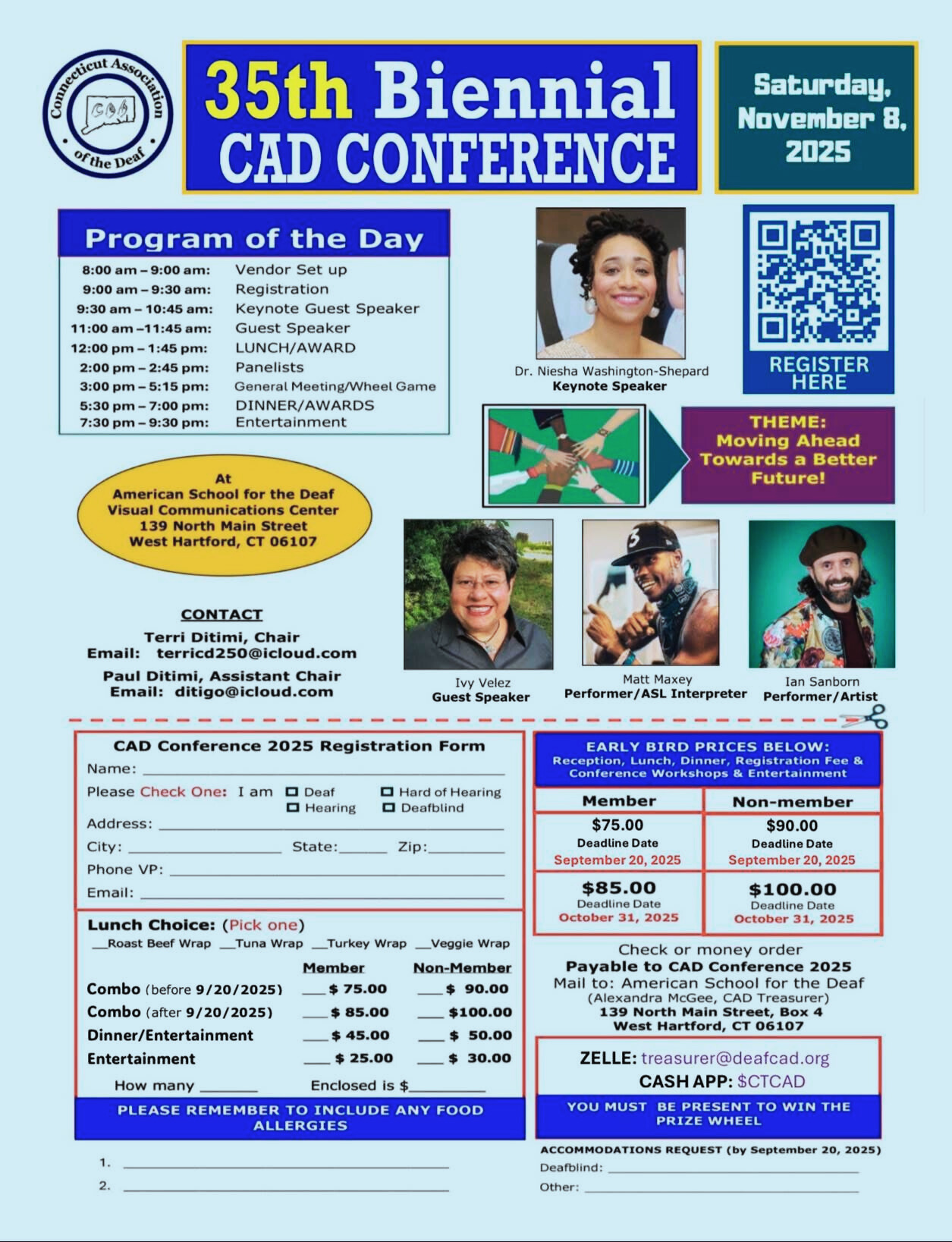 Image description: Upper left corner: Connecticut Association of the Deaf logo; in top center in blue background with 35th Biennial CAD Conference (in yellow and white text:) Upper right corner in blue background and white text: Saturday, November 8, 2025; Below on the left: PROGRAM OF THE DAY 8:00 am - 9:00 am Vendor Set up 9:00 am - 9:30 am Registration 9:30 am - 10:45 am Keynote Guest Speaker11:00 am - 11:45 am Guest Speaker12:00 pm - 1:45 pm LUNCH / AWARD 2:00 pm - 2:45 pm Panelists 3:00 pm - 5:15 pm General Mtg / Wheel Game 5:30 pm - 7:00 pm DINNER / AWARDS 7:30 pm - 9:30 pm Entertainment Center: picture of KEYNOTE SPEAKER: Dr. Niesha Washington-Shepard, right: QR Code "Scan Me" Picture of 7 different arms in union pointing towards the THEME: Moving Ahead Towards a Better Future! Below on right in a yellow oval in black text: at American School for the Deaf Visual Communications Center 139 North Main Street West Hartford, CT 06107; pictures of: Ivy Velez, GUEST SPEAKER, Matt Maxey: Performer/ASL Interpreter and Ian Sanborn: Performer/Artist. CONTACT: Terri Ditimi, Chair Email: terricd250@icloud.com, Paul Ditimi, Assistant Chair Email: ditigo@icloud.com Below: registration form with payment options. |