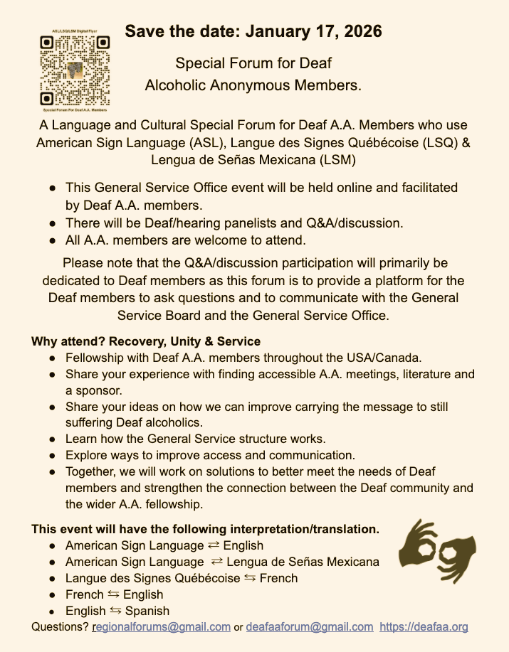 Image Description: The flyer has an off white background with brown text. On the upper left corner: a QR code. Top center: Save the date: January 17, 2026. Below center: Special Forum for Deaf Alcoholic Anonymous Members A Language and Cultural Special Forum for Deaf A.A. Members who use American Sign Language (ASL), Langue des Signes Québécoise (LSQ) & Lengua de Señas Mexicana (LSM) Below with bullet points: The event will be held online and facilitated by Deaf A.A. members. There will be Deaf/hearing panelists and Q&A/discussion. All A.A. members are welcome to attend. Additional note: The Q&A/discussion participation will primarily be dedicated to Deaf members as this forum is to provide a platform for the Deaf members to ask questions and to communicate with the General Service Board and the General Service Office.