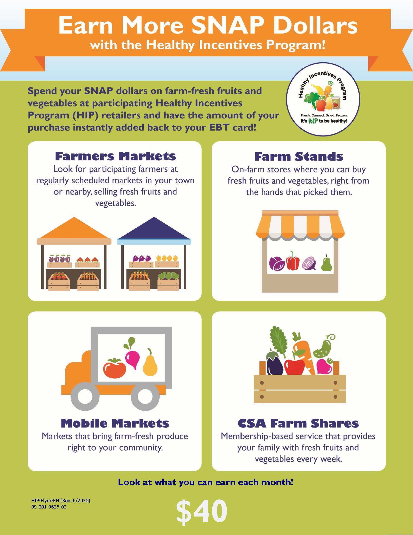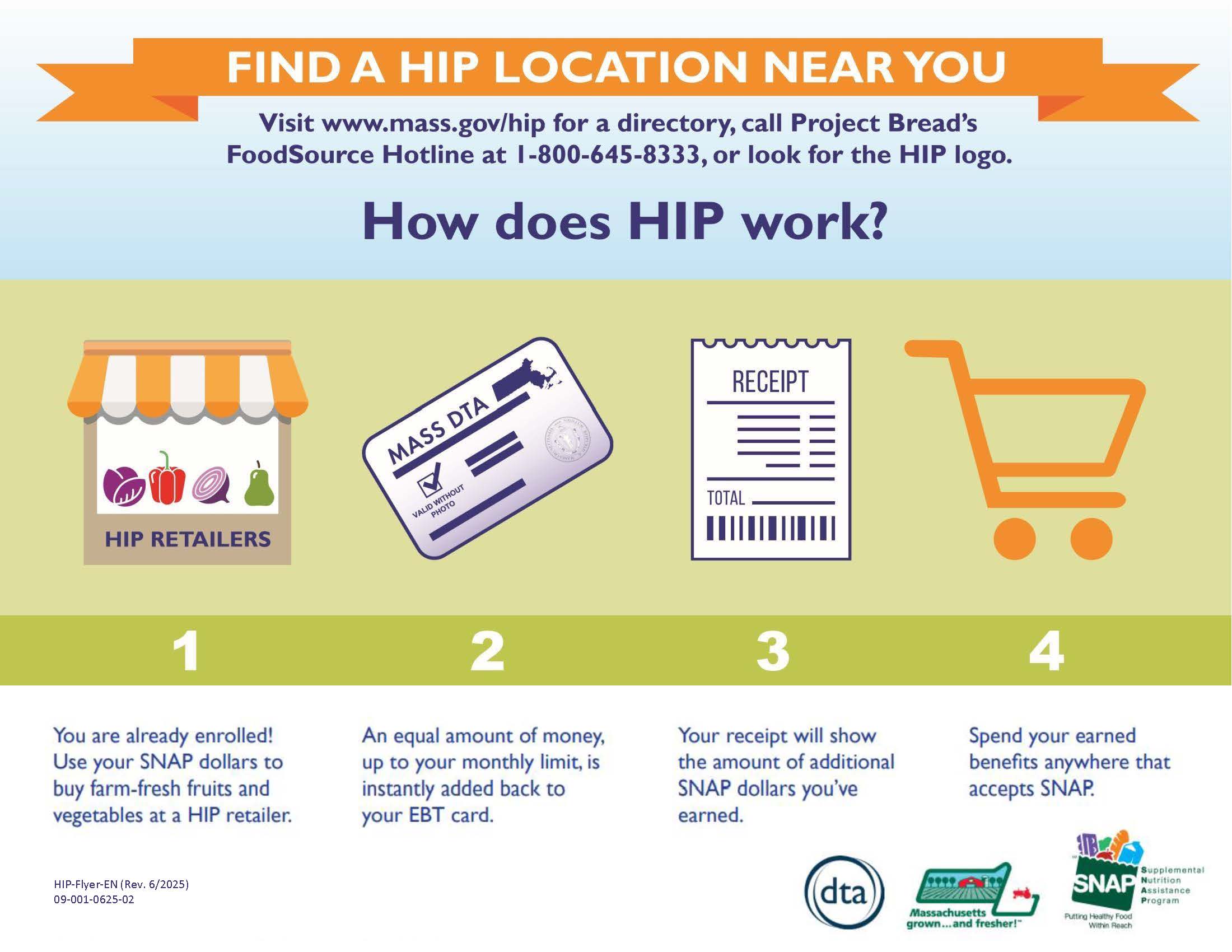 Image description: Image 1: Background with soft colors with fruits and vegetables, banner: orange with white text: Earn More SNAP Dollars with the Healthy Incentives Program! Below in dark blue text: Spend your SNAP dollars on farm-fresh fruits and vegetables at participating Healthy Incentives Program (HIP) retailers and have the amount of your purchase instantly added back to your EBT card! There are 4 icons: top left: 2 tents with produce displayed under them: Farmers Markets-look for participating farmers at regularly scheduled markets in your town or nearby, selling fresh fruits and vegetables, top right: fresh produce under a white and orange tent, Farm Stands: On-farm stores where you can buy fresh fruits and vegetables, right from the hands that picked them; bottom left: a truck with displays of fresh produce on it, Mobile Markets: Markets that bring farm-fresh produce right to your community; bottom right: a box full of fresh produce, CSA Farm Shares: Membership-based service that provides your family with fresh fruits and vegetables every week. At the bottom: Look at what you can earn each month! $40 Image 2: Background with soft colors, banner: orange with white text: Find a HIP Location Near you. Below, in dark blue text: Visit www.mass.gov/hip for a directory, call Project Bread's FoodSource Hotline at 1-800-645-8333 or look for the HIP logo. How does HIP work? Below are 4 steps with icons: 1) a white and orange tent labeled HIP RETAILERS with produce underneath: You are already enrolled! Use your SNAP dollars to buy farm-fresh fruits and vegetables at a HIP retailer. 2) MASS DTA card: An equal amount of money, up to your monthly limit is instantly added back to your EBT card. 3) receipt: Your receipt will show the amount of additional SNAP dollars you've earned. 4) Cart icon-Spend your eawrned benefits anywhere that accepts SNAP. Bottom right: logos of dta, Massachusetts grown...and fresher! and SNAP.