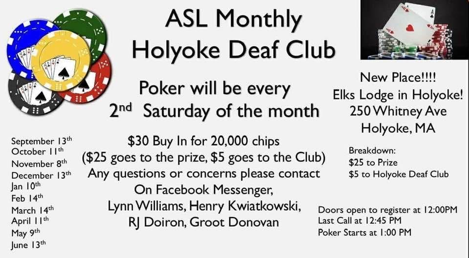 Image description: The flyer has a simple black-and-white design. On Left image of colorful poker chips stacked with an Ace of Hearts card on top. Right: Stack of poker chips with an Ace card on top, reinforcing the poker theme. Header, centered and in bold black text: ASL Monthly Holyoke Deaf Club Below: Poker will be every 2nd Saturday of the month; on the left side, a list of scheduled poker dates: September 13th, October 11th, November 8th, December 13th, January 10th, February 14th, March 14th, April 11th, May 9th and June 13th. Center section: Buy-In Details: $30 Buy-In for 20,000 chips Breakdown: ($25 goes to the prize, $5 goes to the Club) Contact info: Any questions or concerns please contact On Facebook Messenger: Lynn Williams, Henry Kwiatkowski, RJ Doiron, Groot Donovan Right side in bold black text: New Place!!!! Address: Elks Lodge in Holyoke! 250 Whitney Ave, Holyoke, MA Breakdown: $25 to Prize $5 to Holyoke Deaf Club Time: Doors open to register at 12:00 PM Last Call at 12:45 PM Poker Starts at 1:00 PM |