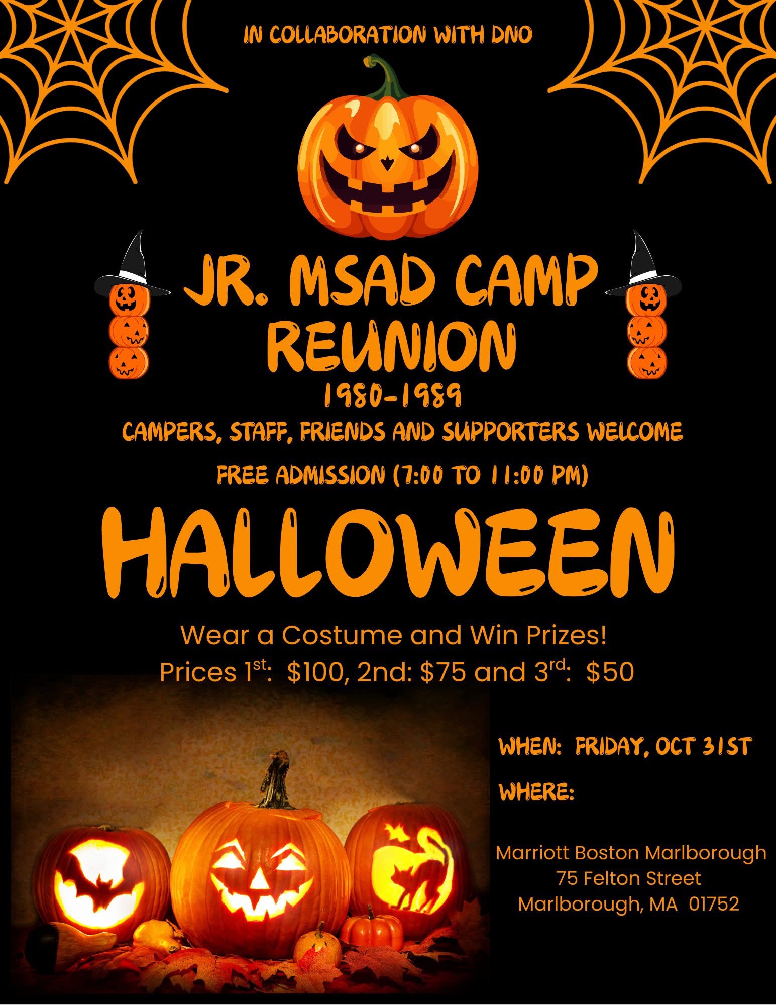 Image description: The flyer has a black background with bright orange Halloween-themed graphics and text. Decorations include carved pumpkins, spider webs in the corners, and pumpkin characters with witch hats. Fonts are fun, playful, and bold, mostly in bright orange. Top center in orange text: IN COLLABORATION WITH DNO, below in center: a large, grinning jack-o'-lantern with an evil expression. Below: a vertical stack of three smiling jack-o'-lanterns, wearing a witch hat (on each side of the main title) JR. MSAD CAMP REUNION 1980-1989 Campers, Staff, Friends and Supporters Welcome, Free Admission (7:00 to 11:00 PM) Below in very large text: HALLOWEEN; below in smaller text: Wear a Costume and Win Prizes! Prices 1st: $100, 2nd: $75 and 3rd: $50 Bottom: three carved pumpkins with glowing jack-o’-lantern faces, surrounded by autumn leaves and small gourds. On the bottom right: When: Friday, Oct 31st Where: Marriott Boston Marlborough 75 Felton Street Marlborough, MA 01752 |