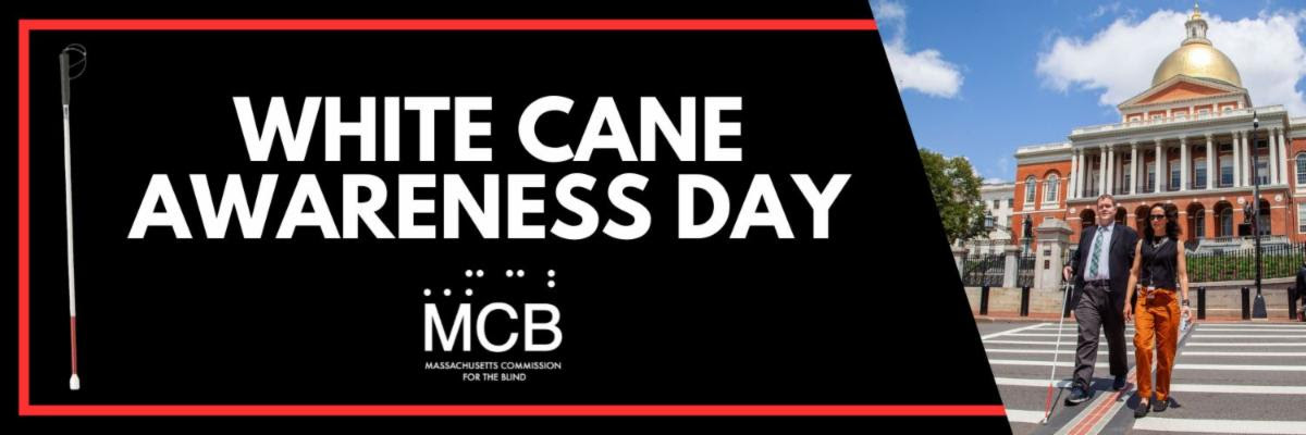 Image description: Black background with a thin red border taking up 3/4 of the flyer with WHITE CANE AWARENESS DAY in white caps font and below is MCB in Braille and MCB in caps and MCB spelled out. Left side: White Cane in Black, white and red with a white tip. On the right, there is a picture of a blind man in a business, using his white cane, walking with a woman dressed in a black top with orange pants, crossing the street in front of the Massachusetts State House. |