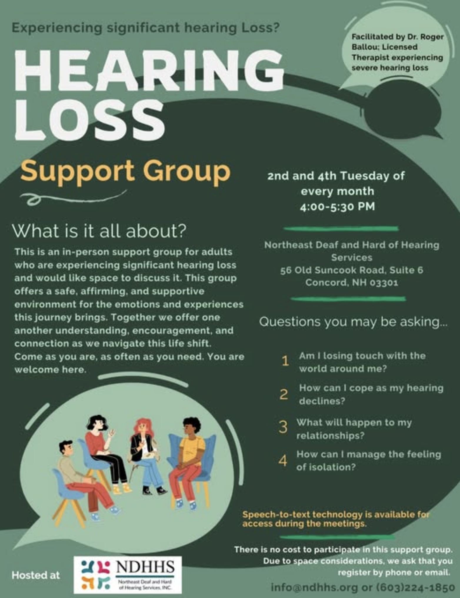 Image description: Flyer with dark green & sage background: Experiencing significant hearing Loss? In white text: HEARING LOSS (in yellow text) Support Group. Group is Facilitated by Dr. Roger Ballou: Licensed Therapist experiencing severe hearing loss. Meets on the 2nd and 4th Tuesday of every month from 4:00-5:30 PM, located at Northeast Deaf and Hard of Hearing Services, 56 Old Suncook Road, Suite 6, Concord, NH 03301. What is it all about? This is an in-person support group for adults who are experiencing significant hearing loss and would like space to discuss it. This group offers a safe, affirming, and supportive environment for the emotions and experiences this journey brings. Together we offer one another understanding, encouragement, and connection as we navigate this life shift. Come as you are, as often as you need. You are welcome here. Questions you may be asking... 1 Am I losing touch with the world around me? 2 How can I cope as my hearing declines? 3 What will happen to my relationships? 4 How can I manage the feeling of isolation? Speech-to-text technology is available for access during the meetings. There is no cost to participate in this support group. Due to space considerations, we ask that you register by phone or email. Contact information is provided as info@ndhhs.org or (603)224-1850. An illustration of four individuals sitting on chairs, interacting with each other in conversation.The support group is Hosted at NDHHS Northeast Deaf and Hard of Hearing Services, INC. At the bottom left: NDHHS logo. |