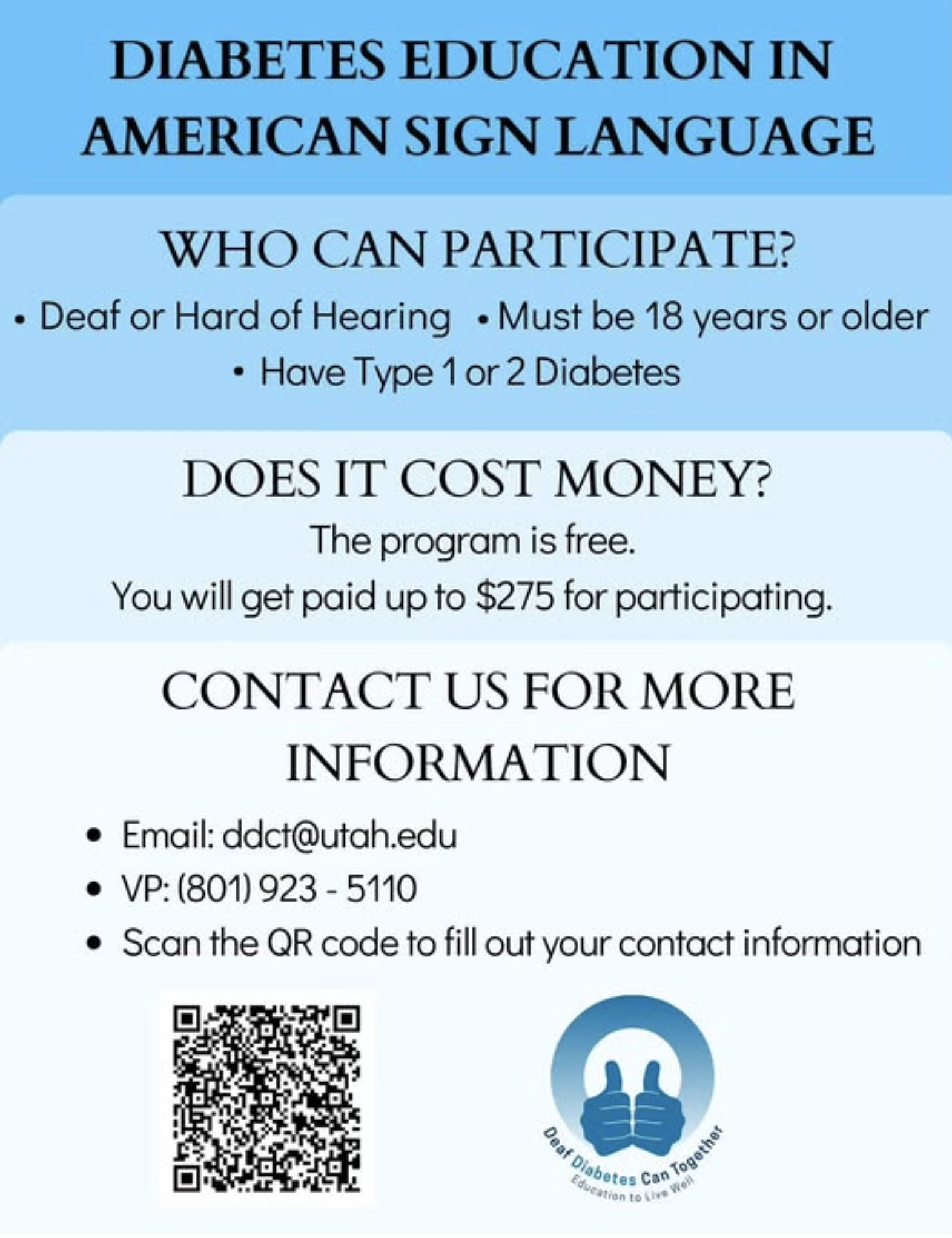 Image description: Flyer background: In robin blue background w/black text: DIABETES EDUCATION IN AMERICAN SIGN LANGUAGE, below in baby blue background in black text: WHO CAN PARTICIPATE? Deaf or Hard of hearing, Must be 18 years or older, Have Type 1 or 2 Diabetes; below in sky blue background w/black text: DOES IT COST MONEY? The program is free. You will get paid up to $275 for participating. Below in lighter blue background w/black text: CONTACT US FOR MORE INFORMATION: email: ddct@utah.edu VP: 801-923-5110 Scan the QR code to fill out your contact information. On the bottom left is a QR code and on the right is the logo of Deaf Diabetes Can Together: Education to Live Well |