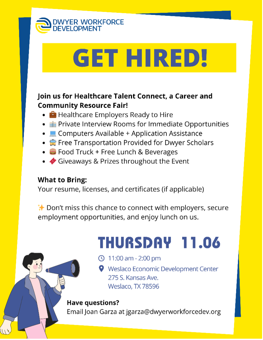 | | Coming up in November, DWD—along with EDC Weslaco and Workforce Solutions—will host a job fair for our Scholars and potential Scholars in Weslaco! More than 15 hiring employers will be on-site, with free resume printing, application stations, and yes—free tacos. We’re proud to support our future healthcare workers as they take the next step toward a rewarding new career. | | |