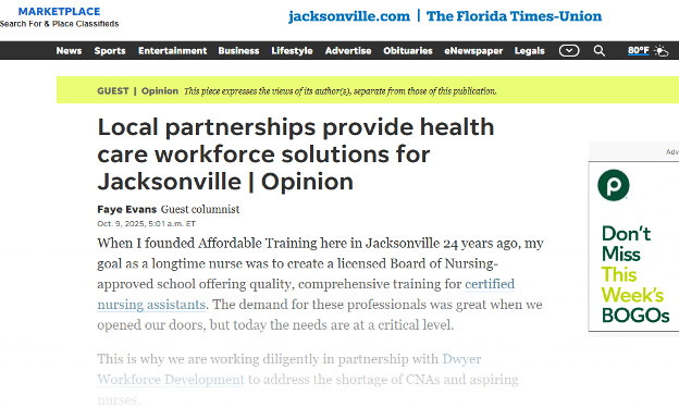 DWD is featured in Florida Times Union, highlighting how our partnership with Affordable Training in Jacksonville, Florida, is helping address the region’s critical nursing shortage.