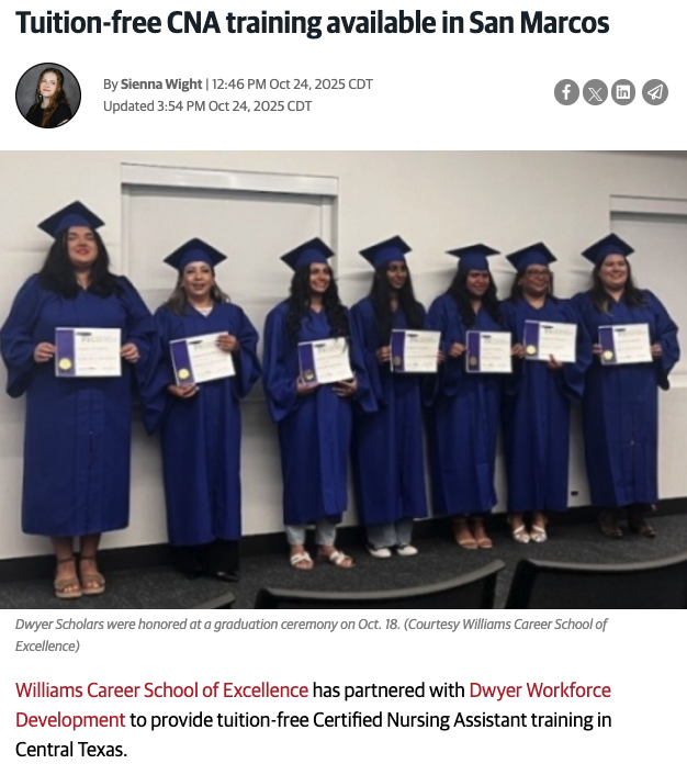 | | Success in San Marcos: Free CNA Training Helping Texans Launch New Careers | | Texas is projected to face a 57,000-nurse shortage by 2032. Community Impact recently highlighted DWD, in partnership with Williams Career School of Excellence, for its efforts to grow the healthcare workforce and help Central Texans build meaningful, stable careers. | | |