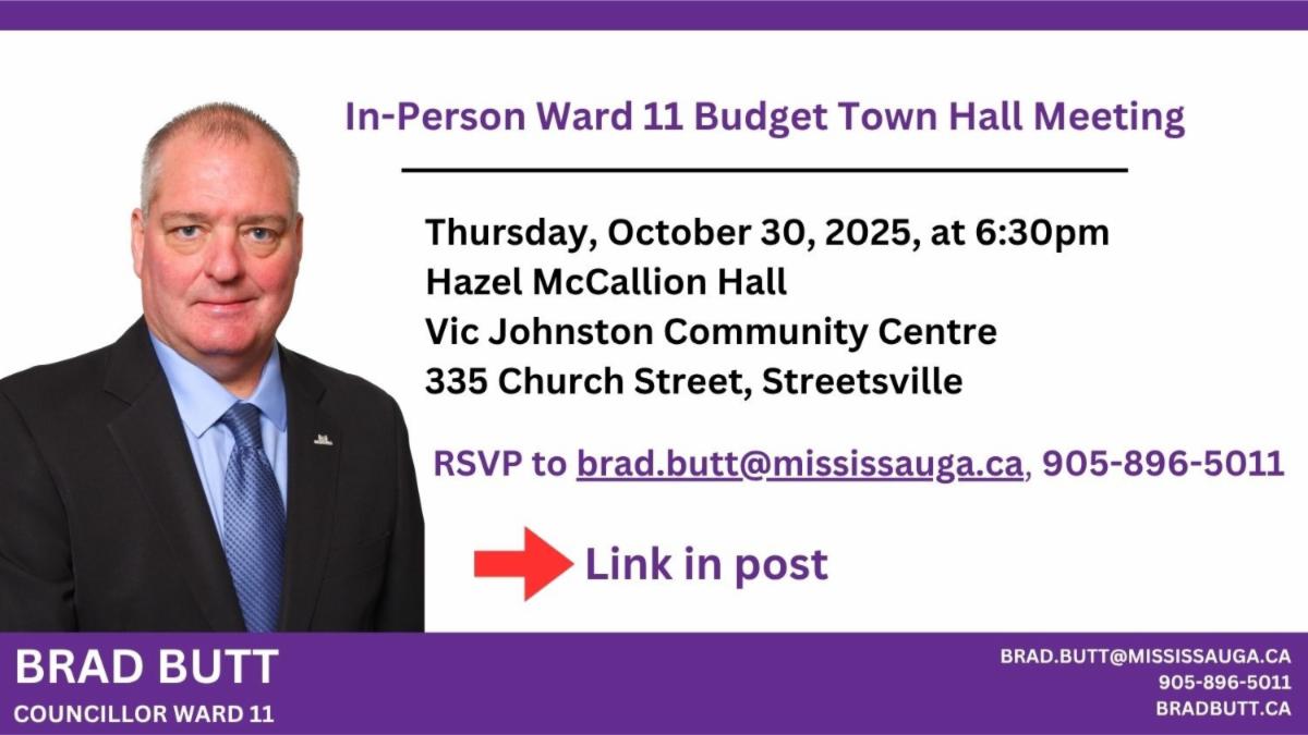 City and Region staff will be on hand to respond to your questions and feedback. RSVP to brad.butt@mississauga.ca or 905-896-5011 if you will be attending. More info at bradbutt.ca/meetings