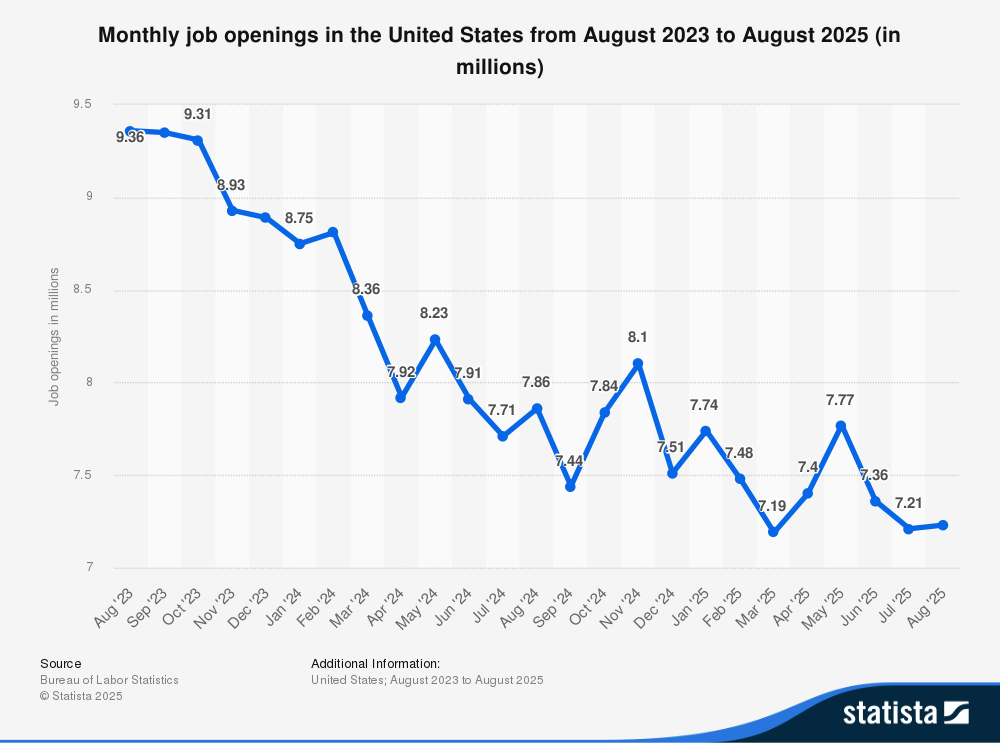 | | Job openings in the U.S. have steadily declined over the past two years — from 9.36 million in August 2023 to 7.21 million in August 2025, according to the Bureau of Labor Statistics. This drop reflects a cooling labor market as employers pull back on hiring amid economic uncertainty and slower growth, signaling a shift from the tight job market seen in the post-pandemic years. | | Source: Bureau of Labor Statistics, via Statista (2025). “Monthly job openings in the United States from August 2023 to August 2025 (in millions).” Statista | |