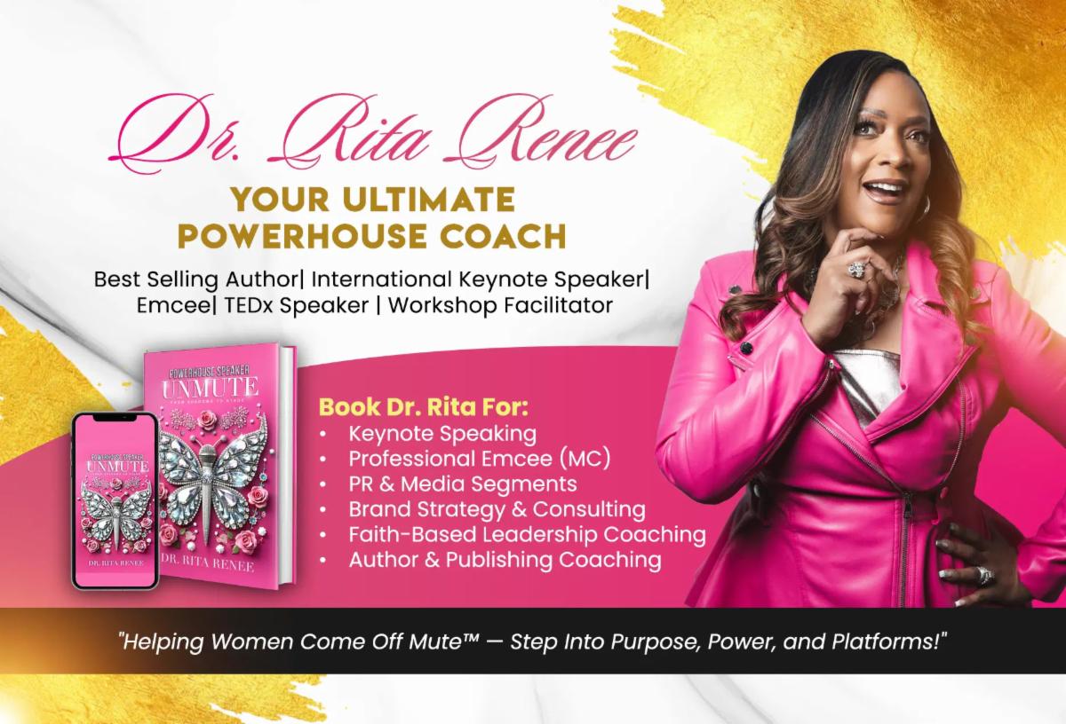 Dr. Rita Renee is a TEDx and International Keynote Speaker, Author, and Coach who is passionate about helping women come off mute—stepping out of the shadows, off the sidelines, and onto platforms to share their authentic voices with confidence and authority.