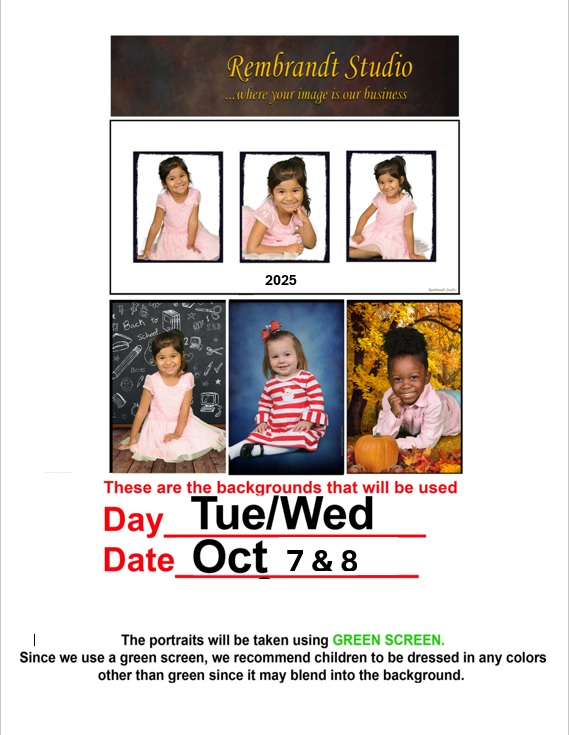 October 7 & 8: Picture Days--See your Brightwheel messages for your assigned day