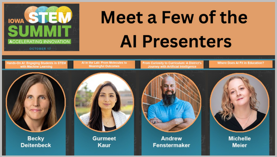 | This event, sponsored by Microsoft, is perfect for classroom teachers, students, administrators, business partners, and community leaders. Attendees will find valuable insights and connections to help advance STEM education and workforce connections in Iowa. And there's so much more than AI! | Registration DEADLINE: October 9 | |