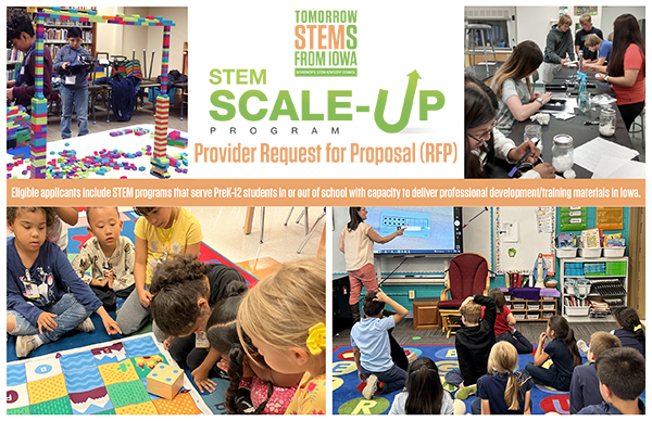 The Iowa STEM Council is seeking organizations to provide prospective programs for the 2026-29 STEM Scale-Up program menu. Through a proposal and selection process, program providers will need to provide evidence-based STEM programs for Iowa STEM Scale-Up educators to use in their classrooms and out of school learning spaces.