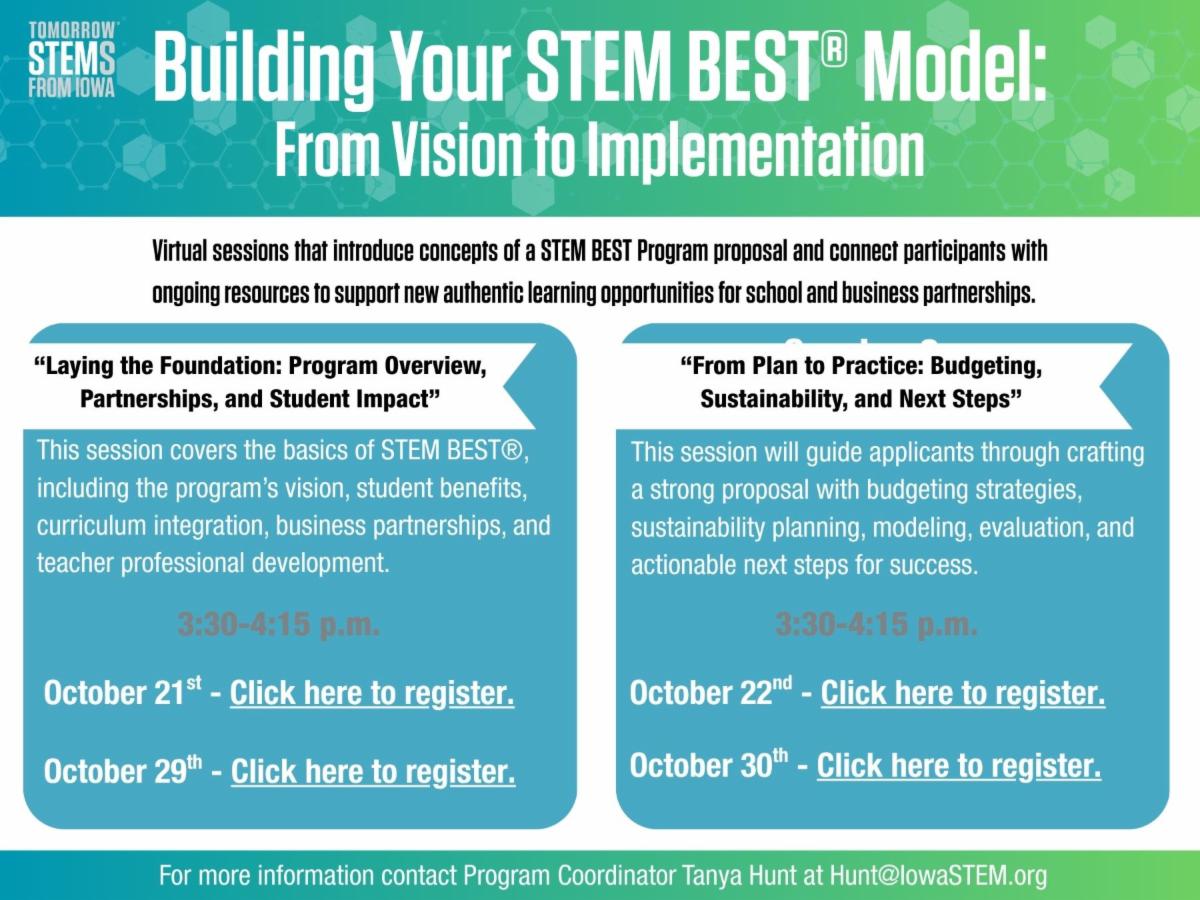 For those interested in applying or learning about STEM BEST, the Iowa STEM Council is also providing webinar sessions to assist your school with the application. The webinars will have a primary focus of coaching and covering all the aspects within the application process with the intent being to serve as a resource for those applying.