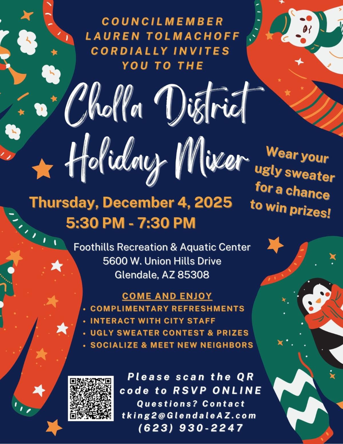 Save the date for our 9th Annual Cholla District Holiday Mixer on Thursday, Dec. 4, 2025, 5:30 PM - 7:30 PM at the Foothills Recreation and Aquatics Center.
