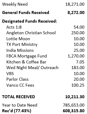 FBCA family, remember we have added our building payment to the church budget again for 2025, so we need every member to be very faithful in your giving this year. Please add any gifts you'd like to give for "God's Vision In Action" -- for our new building payments -- to your regular budget contribution.