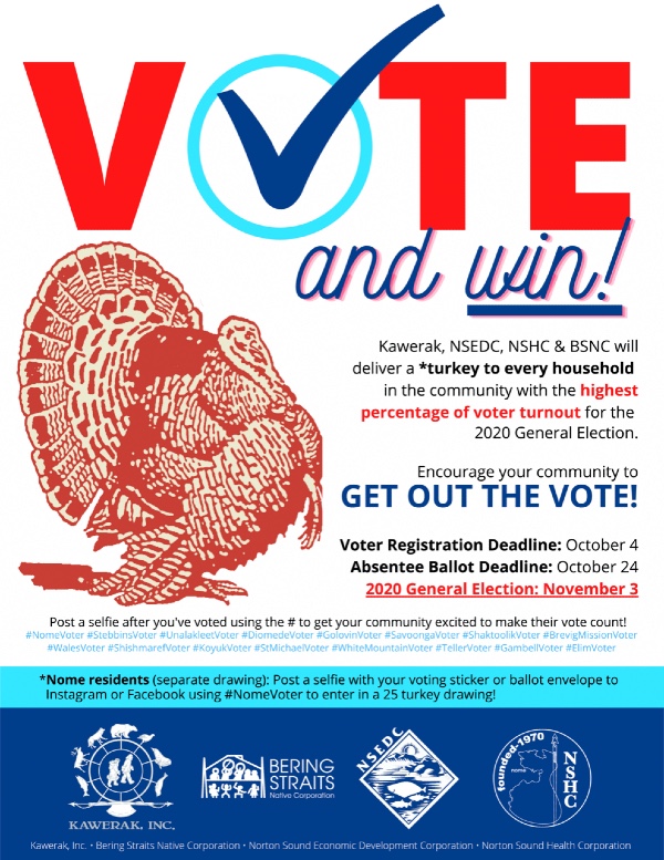 Get your whole community to vote and EVERYONE can win a turkey! See kawerak.org/contest for more details.