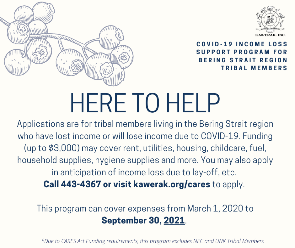 Income loss could be current or predicted; if you anticipate laid off or losing income due to COVID-19 you may be eligible to apply in advance. Visit kawerak.org/cares or call 443-4367 for more details.