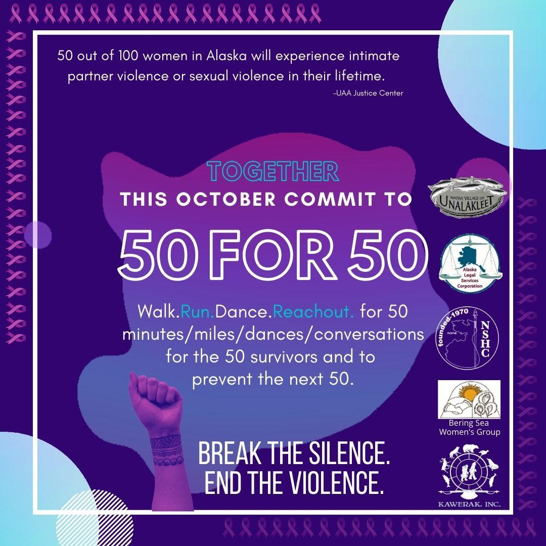 Join us by joining in our 50 for 50 campaign through the month of October. For the 50 out of 100 women who will experience intimate partner or sexual violence in their lifetime, let's commit to 50. 50 miles walking/running, 50 minutes dancing, 50 conversations. And let's prevent the next 50.