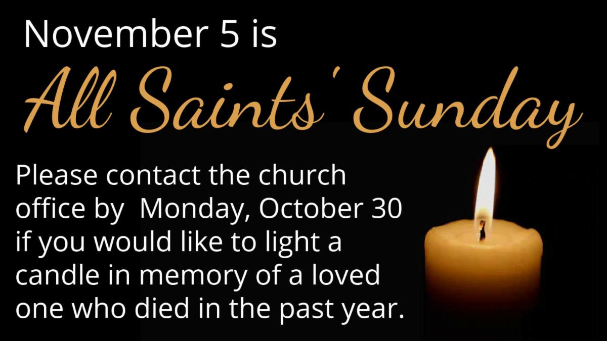 All Saints' Sunday is November 5. We publicly remember and honor those who have died in the previous year and the impact their lives have had on us. If you would like to light a candle in memory of a loved one, please let us know their name on or before Monday, October 30 by calling the church office at (480) 838-1446 or emailing Andrea. | | |