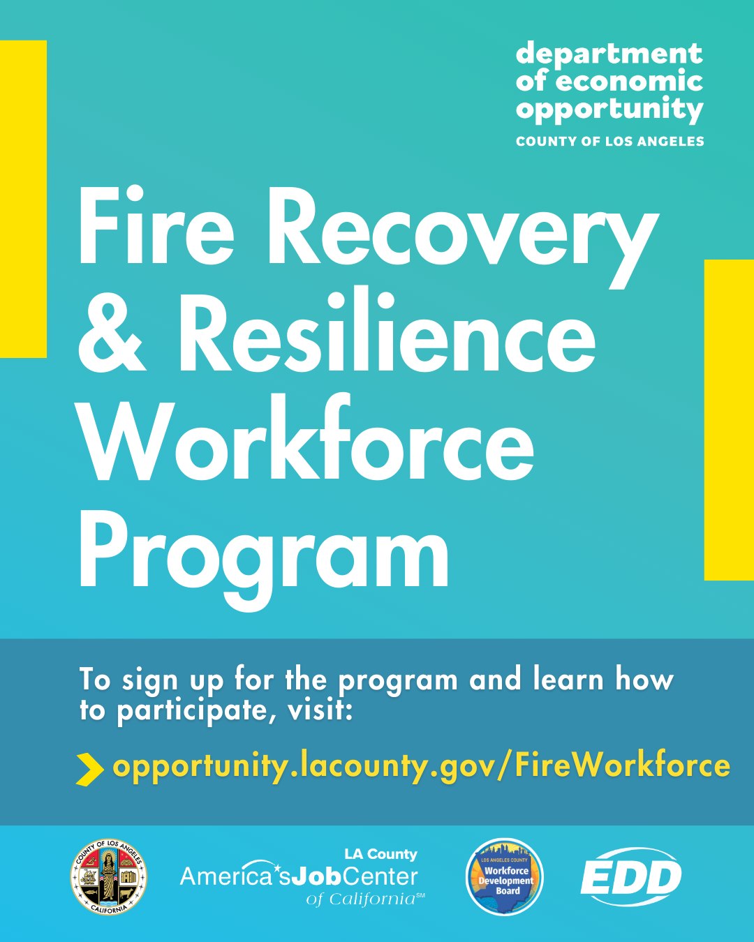 Temporary job opportunities in disaster relief and recovery are now available for people who lost work due to the wildfires. Apply to work with Beaches and Harbor, Parks and Recreation, Public Works, and America's Job Centers of California. Visit the website to learn more about current recruitment opportunities, other services including no-cost training, and how to enroll.